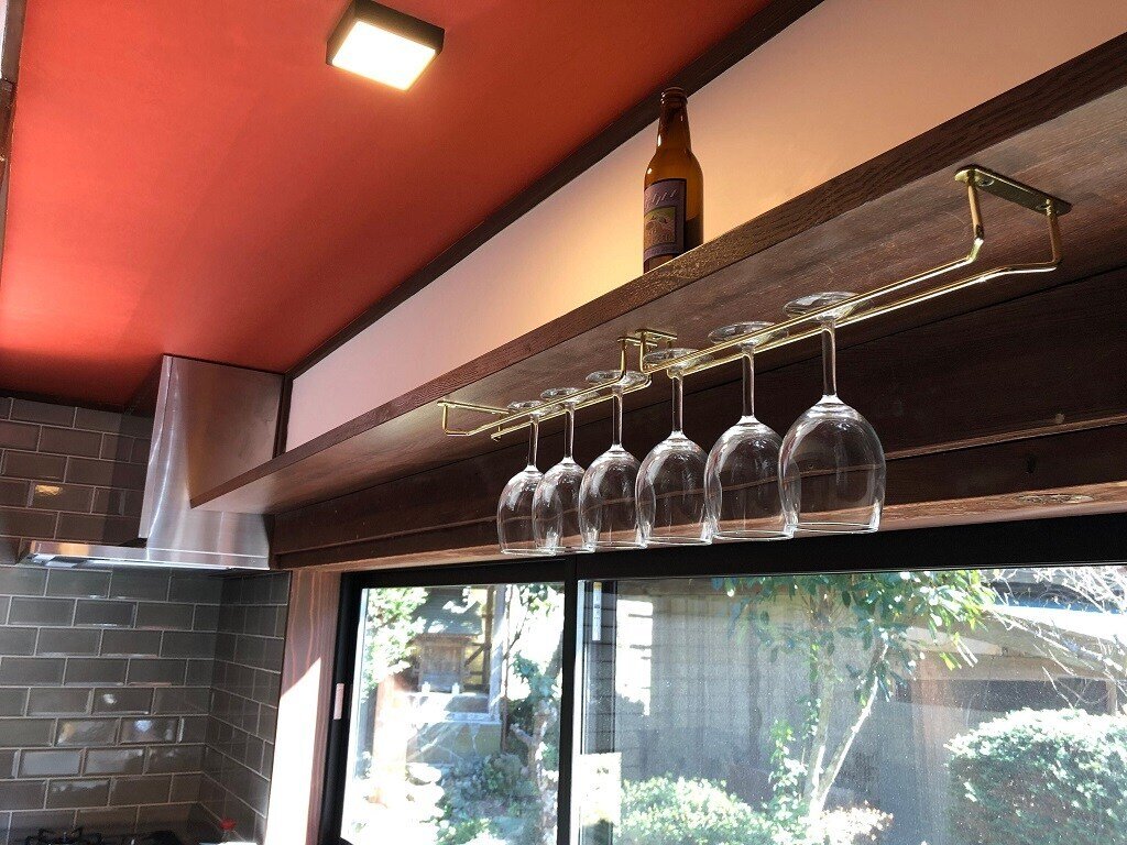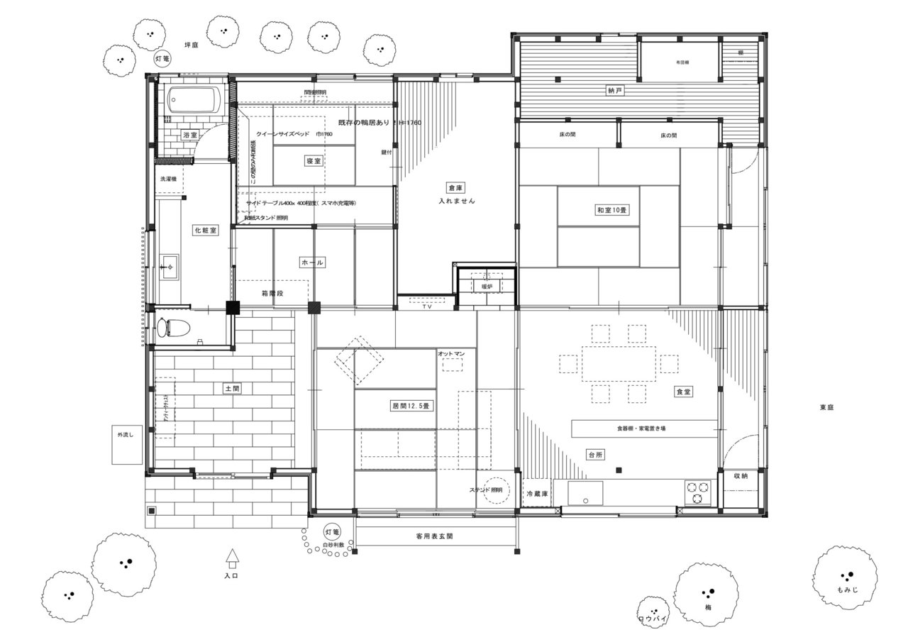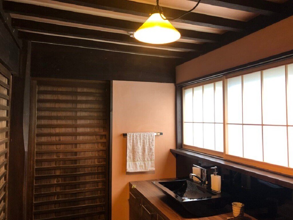 元馬小屋だったところが化粧室・トイレに生まれ変わり、天井高さは低いですが、それがまた古民家の良さ。より素朴なイメージでしつらえました。