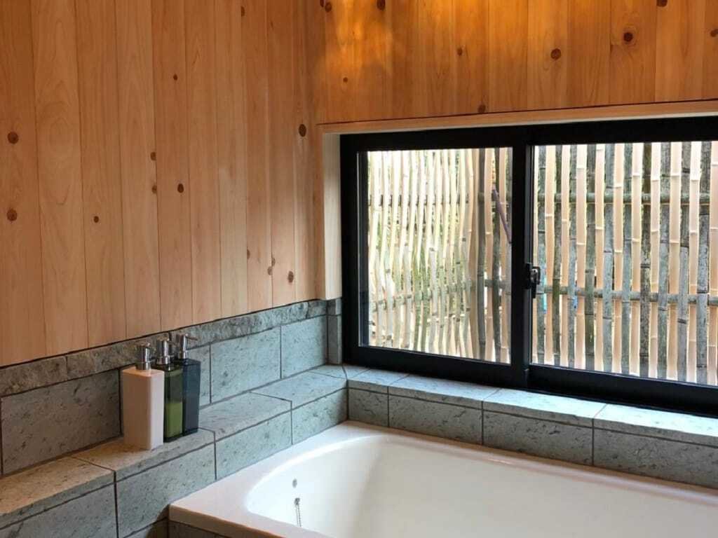 浴室はごく一般的な広さですが、十和田石の床、檜板張りの壁、窓先には坪庭と、本格派。檜の良い香りに包まれて、極上のバスタイムをどうぞ。