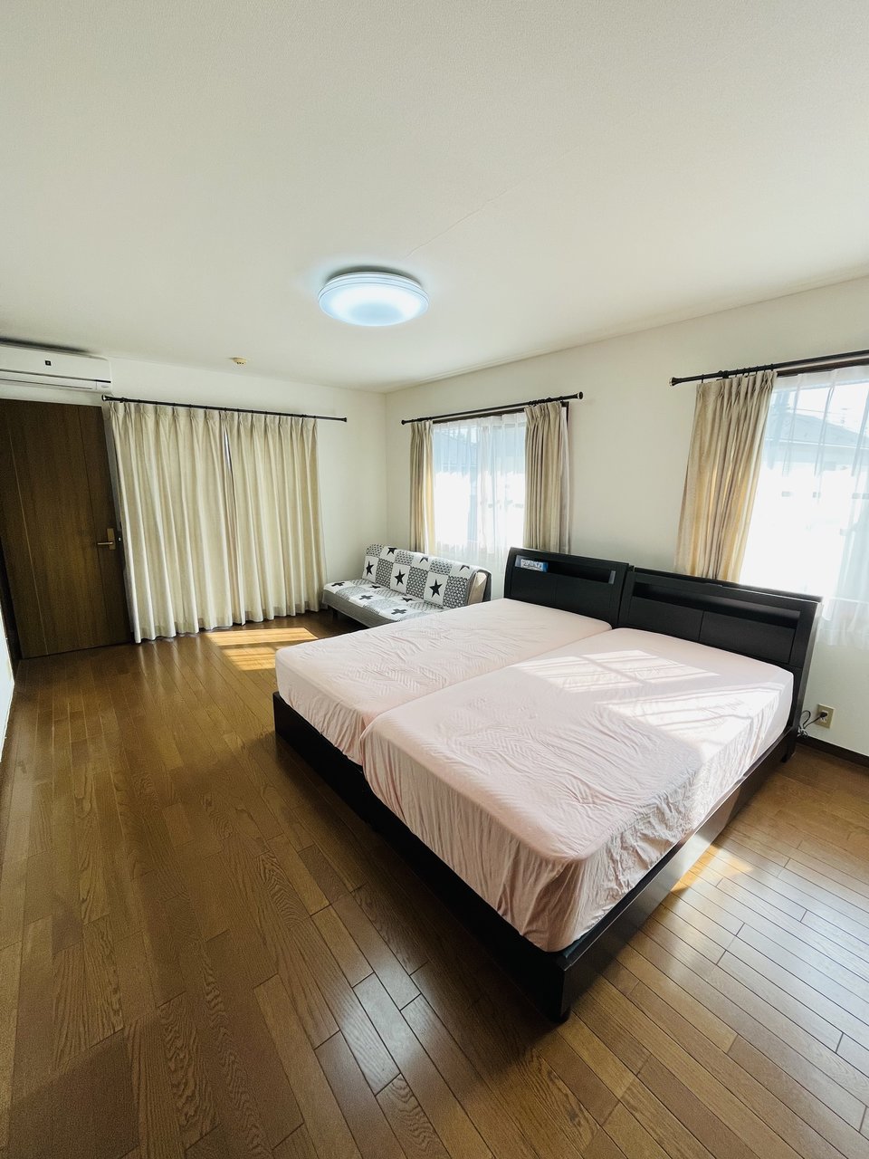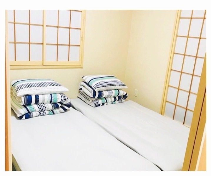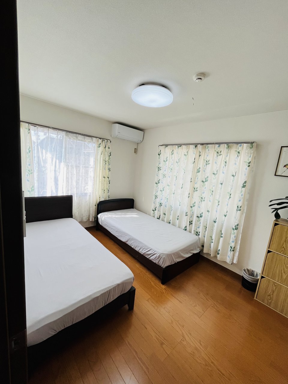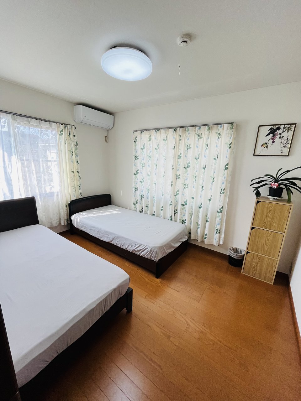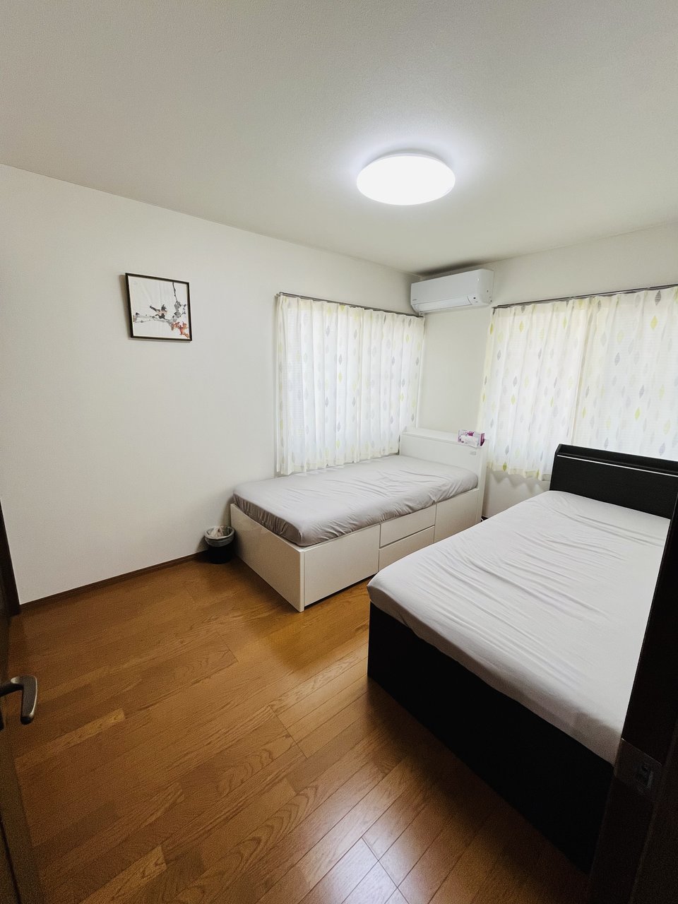 一階の和室にベッドが無し敷布団で二人は泊まれます。