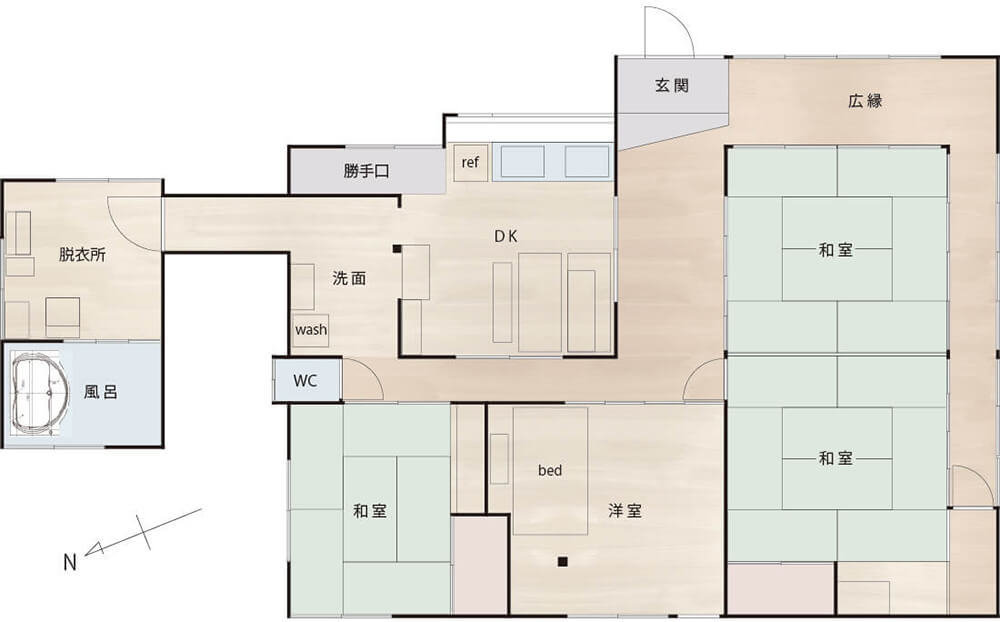 もとは大工さんが親御さんと住むために建てた家。古いながらしっかりした作りです。120平方メートルの広々した間取りが昭和の家屋の心地良さを感じさせます。洋室・DK・脱衣場・風呂場は新規リフォーム部分、清潔な水周りで快適にお過ごしいただけます。平屋ですので足の弱い方も過ごしやすいでしょう。出かけずとも鳥の声を聞きながら昼寝するのが気持ち良い家です。