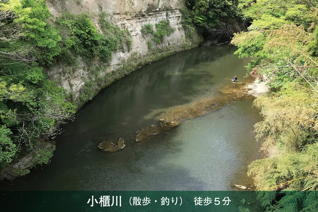 100m先の小櫃川ではヘラブナほかの釣りができます。釣りや温泉、紅葉でも有名な亀山湖は車で5分。車で10分ほどの名水の里・久留里では酒造メーカー見学や木工・陶芸体験、農業体験も楽しめます。ジャックニクラウスが設計したゴルフ場は車で3分。車で30分ほど遠出すれば鴨川シーワールドやマザー牧場といった大型施設もあります。