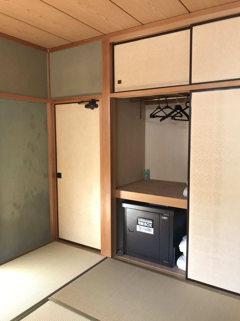 当101号室は、1階6畳の和室で、1~3人用の畳部屋で、布団で寝ていただきます。屏風や簡易な床の間、天然木座卓があり、日本風生活様式が体験できます。また、クローク・押入れ、4桁の暗証番号で開閉するロッカーも押入れ内にあります。