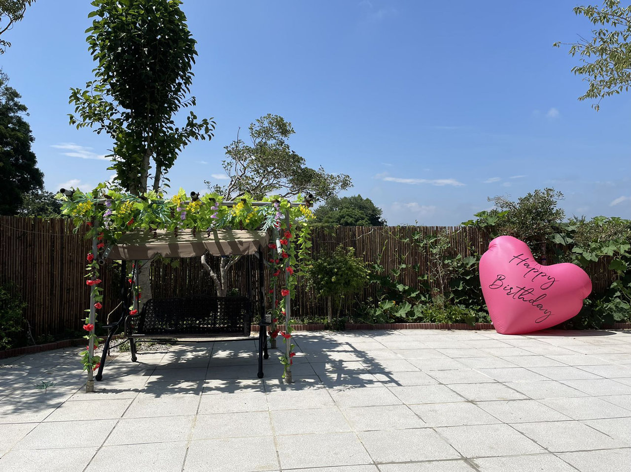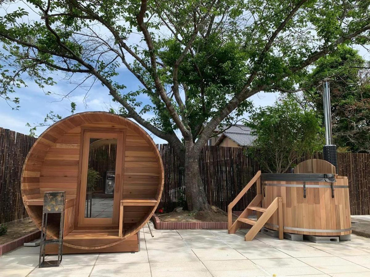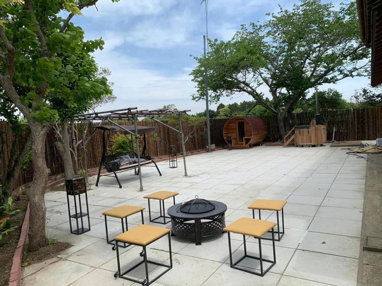 写真にも確認できる広いテラスがあります。誕生日パーティー、花火遊びなど行うことができます。さらに、露天風呂、サウナ設備も提供しており、宴会・遊びの後にお風呂・サウナもお楽しめます。