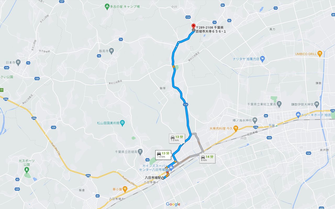 最寄りの八日市場駅から旭日山荘まで7.5kmがあり、車で13分ほど掛かります。