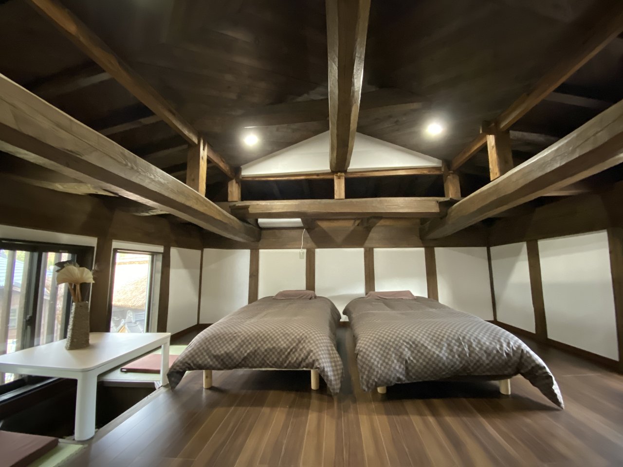 竹林を背に広大な敷地に建つ築百年以上の古民家、母屋の一部に和室「財」と「宝」の客室。