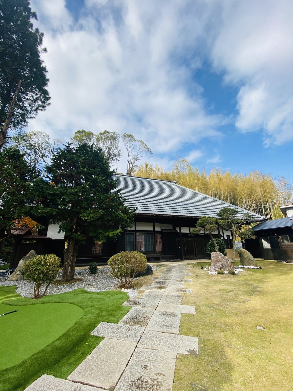 庭のパッティング練習グリーンはゴルフファンの皆様の憩いの空間。