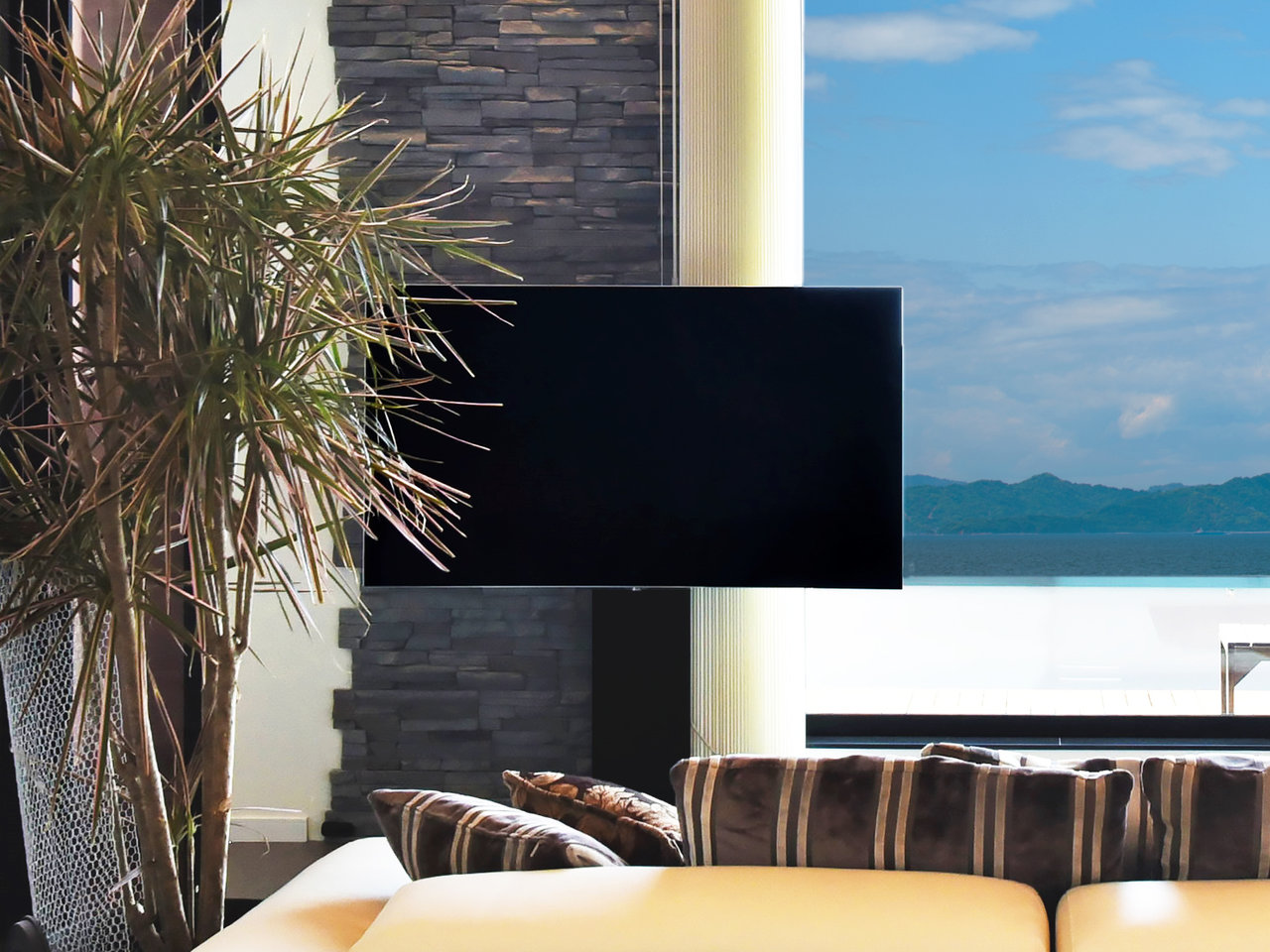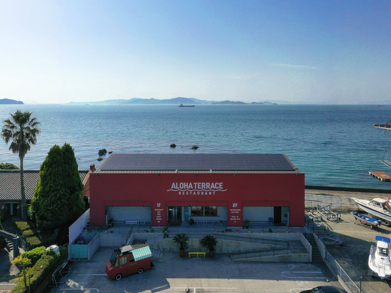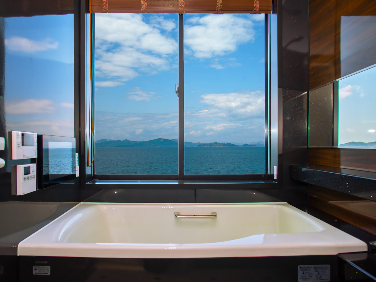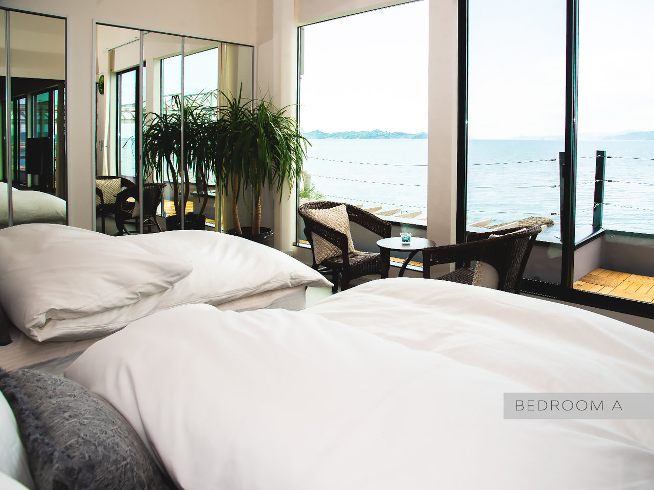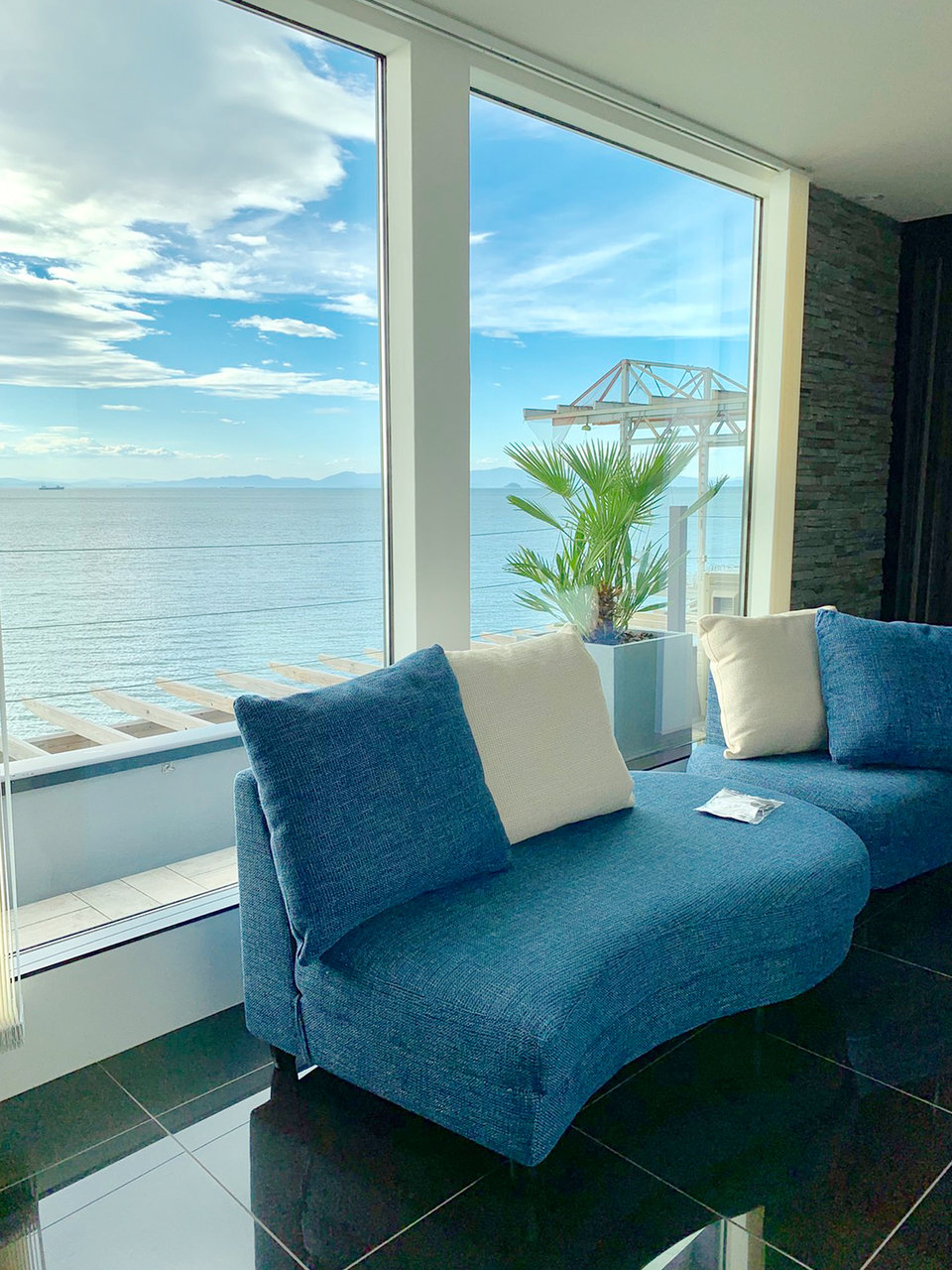 波音がBGM代わりになり、目覚めた時にはガラス窓いっぱいに広がる海や空の青と島々の緑が目に飛び込んできます。