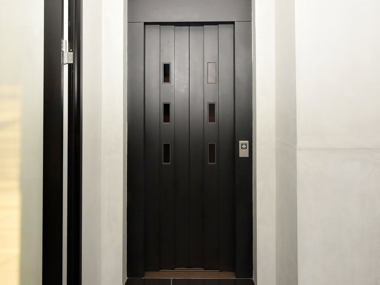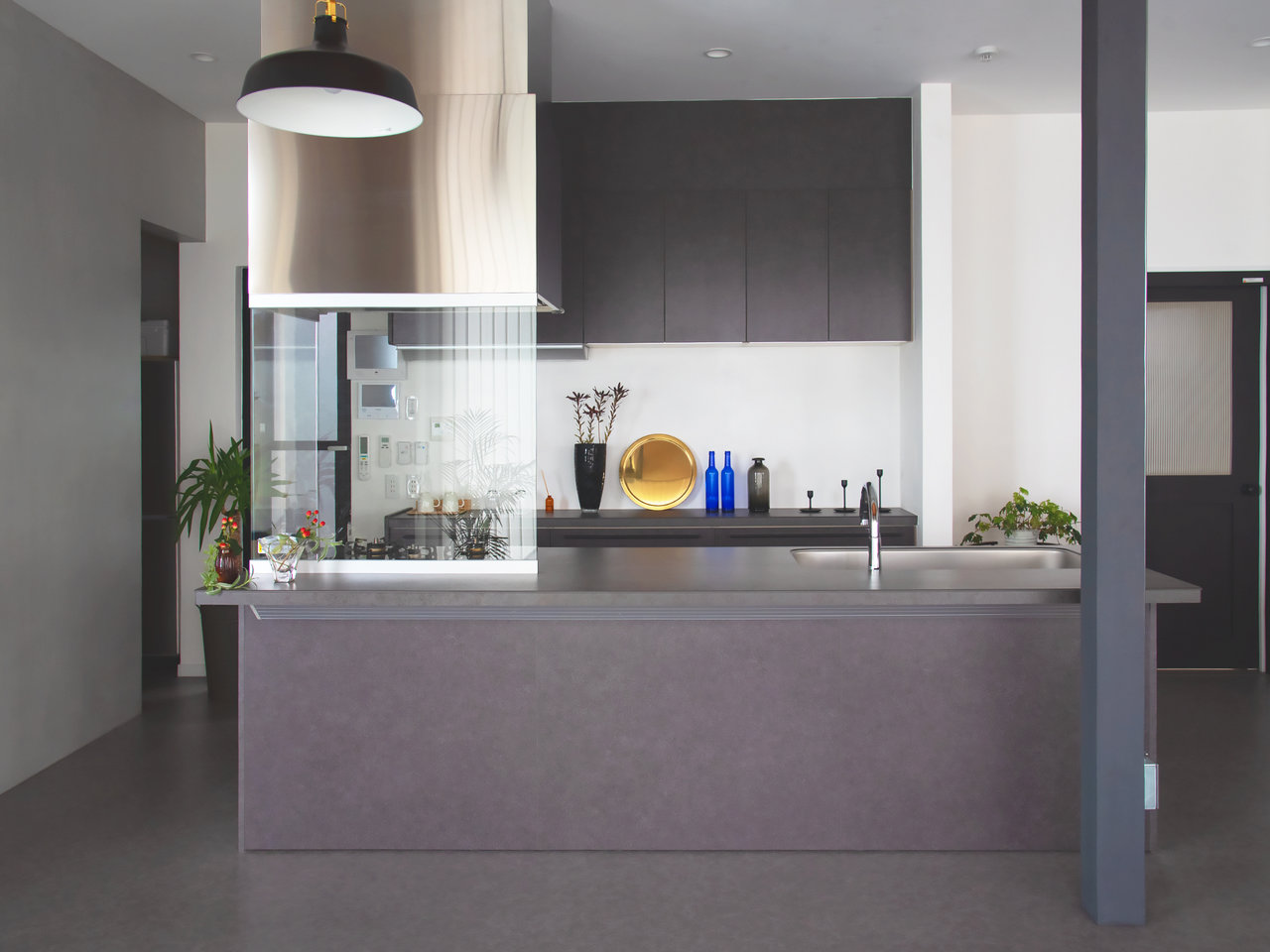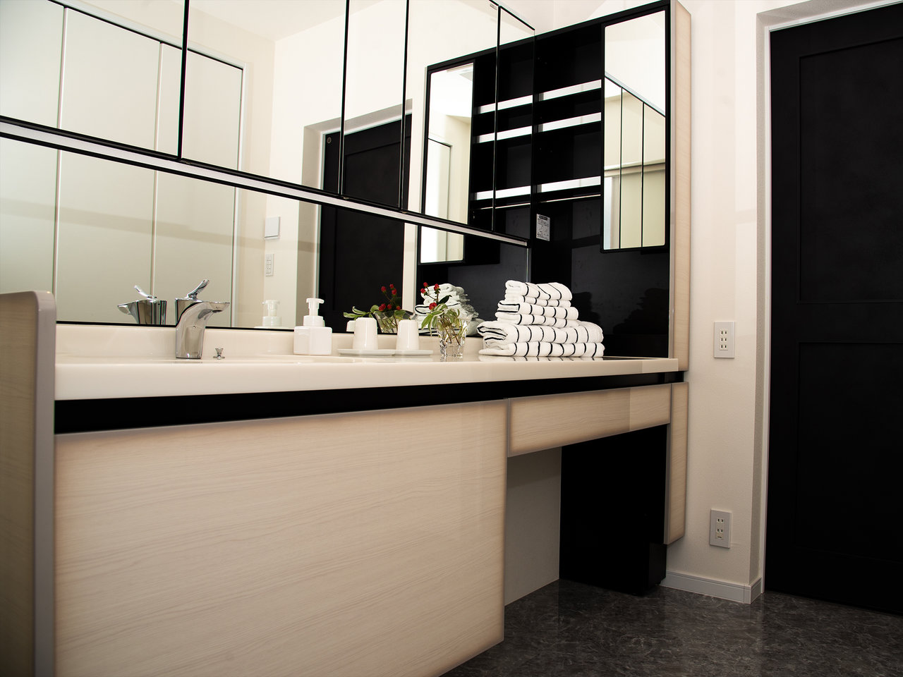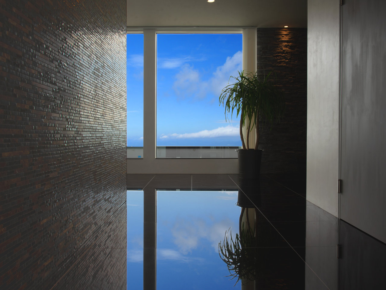 一面ガラス張りと調湿・消臭効果のある「LIXILエコカラット」グレーのタイルが印象的なベッドルーム。