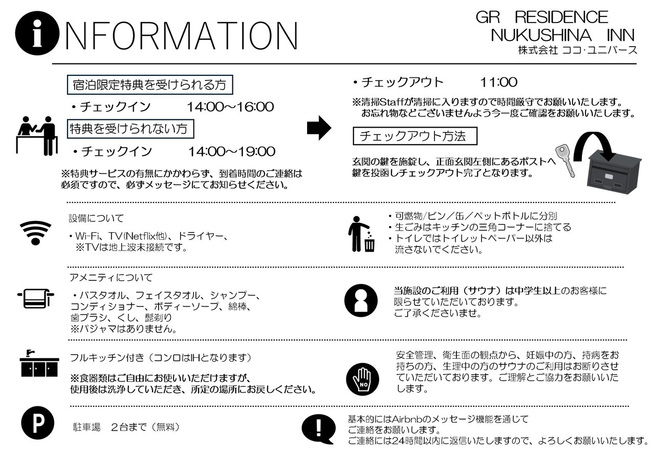 5. 備え付け備品、食器、器具、トイレットペーパー、シャンプー類、タオル等の持ち帰りはご遠慮ください。