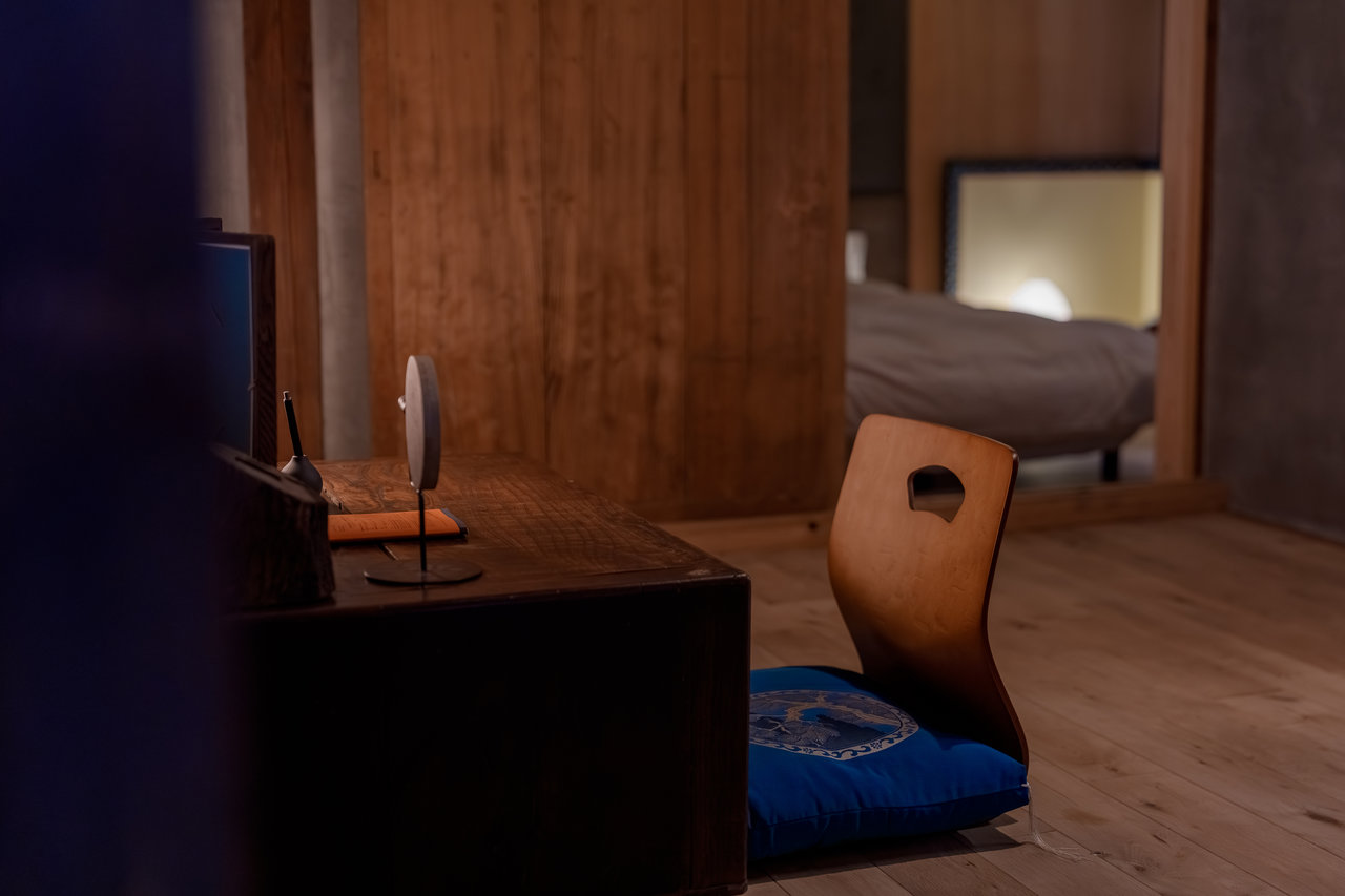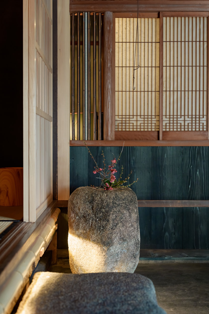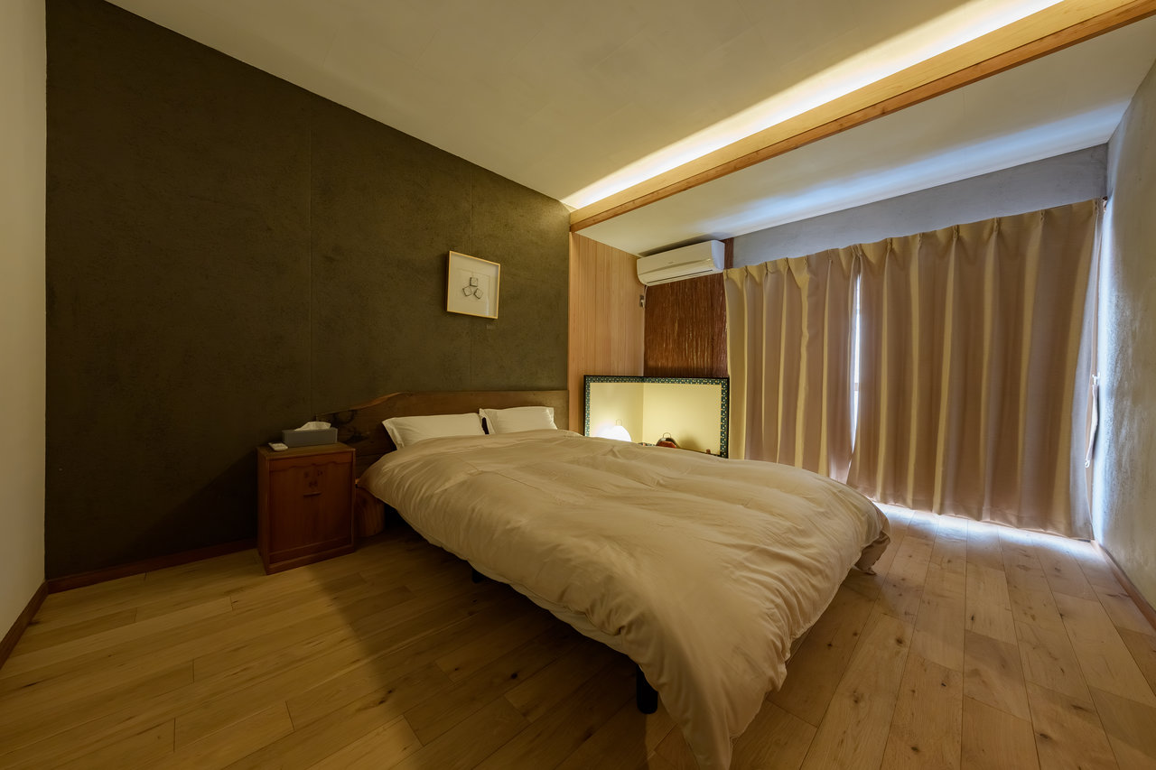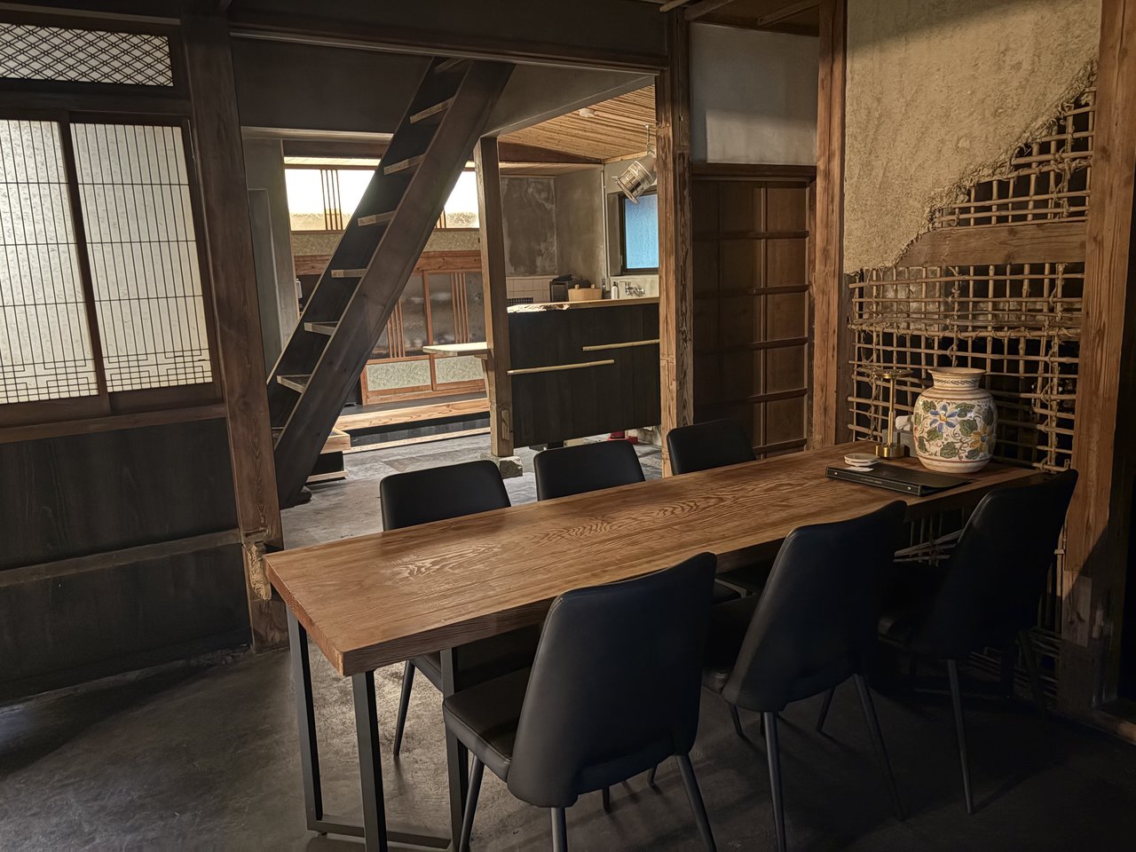 築100年の歴史を刻む太い梁や土壁。そこに、現代の感性を吹き込んだモダンな家具と柔らかな灯りを配置しました。