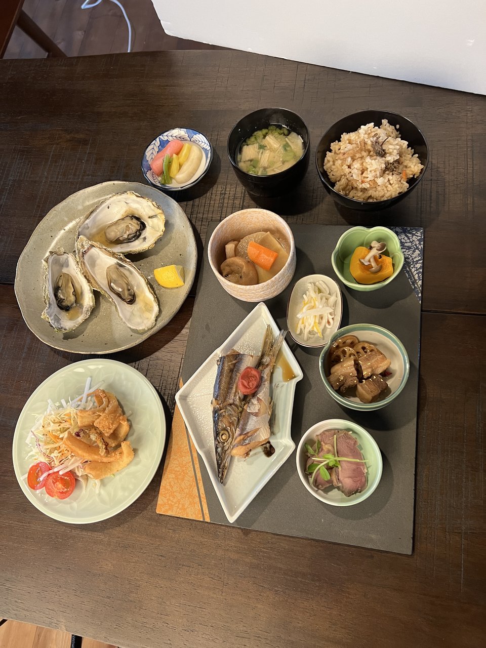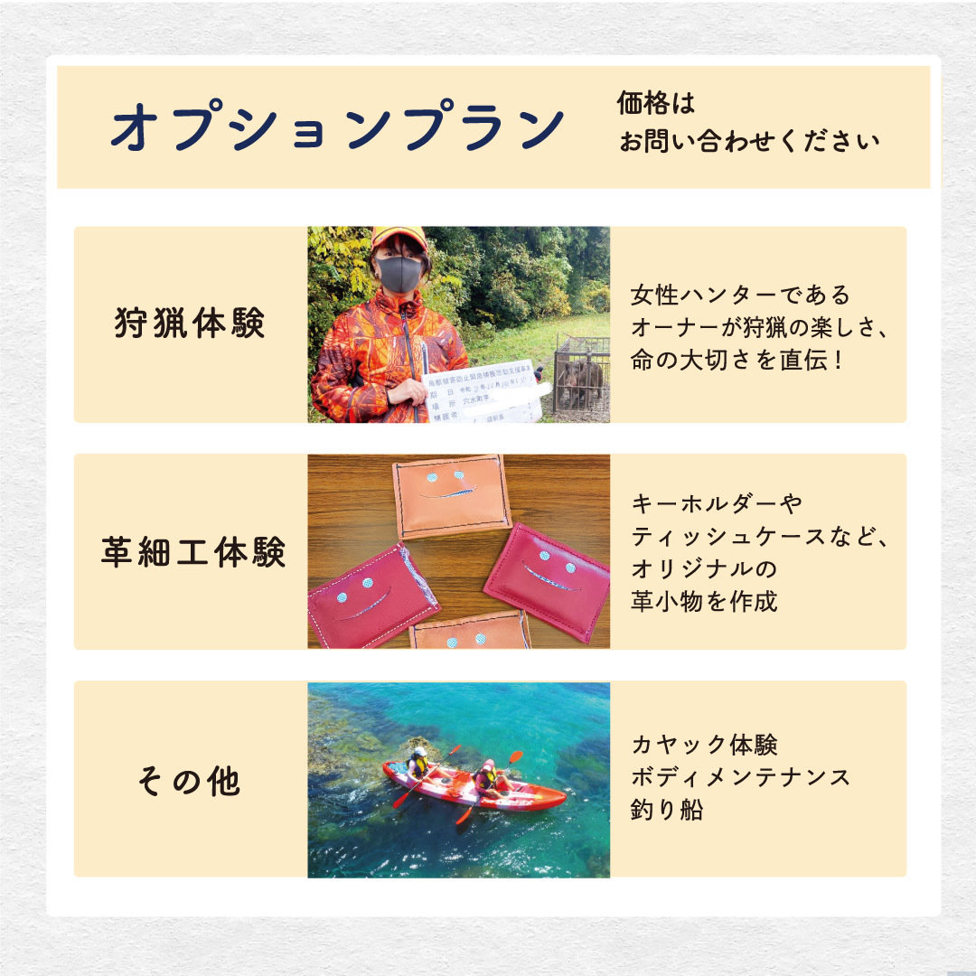 素泊まりの他には、食事付きプランは宿主女性猟師による里山里海の幸ジビエ料理、牡蠣料理が提供されます。