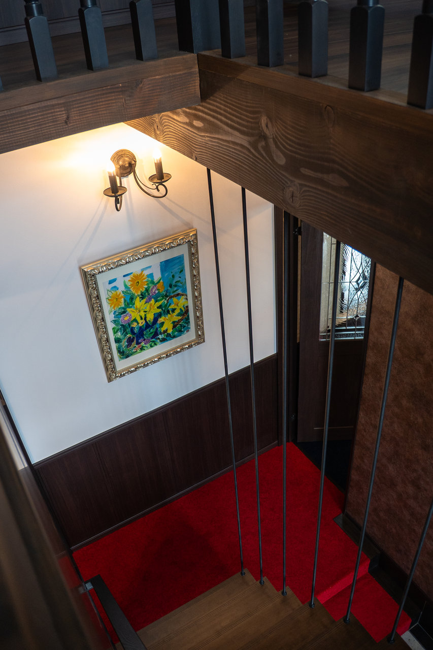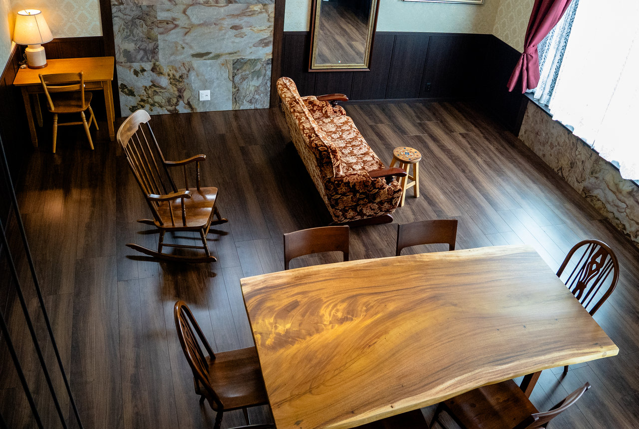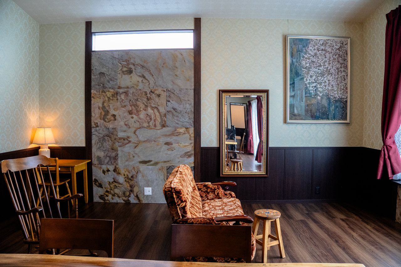 室内には、受賞日本画家・音泉潔子による一点もののダイナミックな原画や、時間をかけて集めたビンテージ家具を配置。