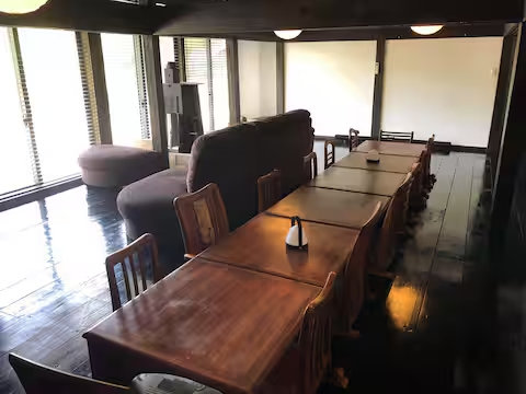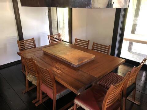 大きな古民家の一階部分です。当初は1階大広間、1階別間(奥の間)、2階、の3施設としてそれぞれお貸ししていましたが、コロナウイルスの影響もあり、現在は一日1組のみご予約を受けています。1階奥の間も解放し、ゆったりとお過ごしいただいています。また、10名以上でご予約いただければ2階もご利用いただけます。気軽にお問い合わせください。備え付けの浴室はありますが、近くに源泉掛け流し100%の温泉「やまなみ温泉」「いやしの湯」「さがみ湖温泉うるり」があるのでおすすめしています。