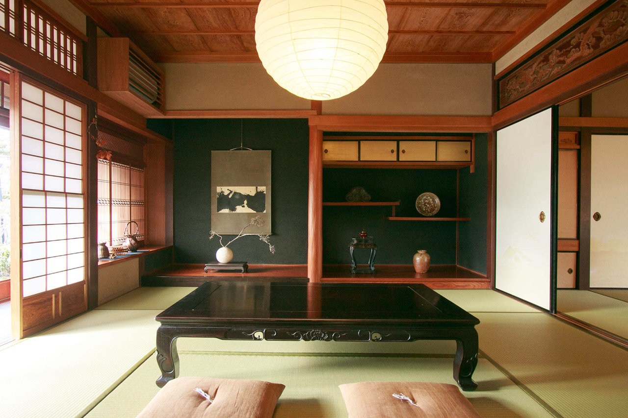 様々な種類を使った木の温もり、ゆらめく硝子、畳の心地よさ、