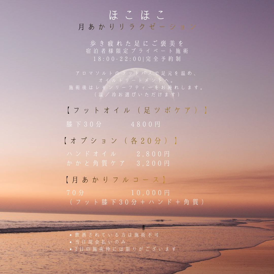 宿泊者様限定「月あかりフットリラクゼーション(有料)」3月27日より実施。
