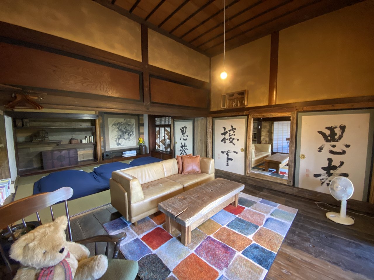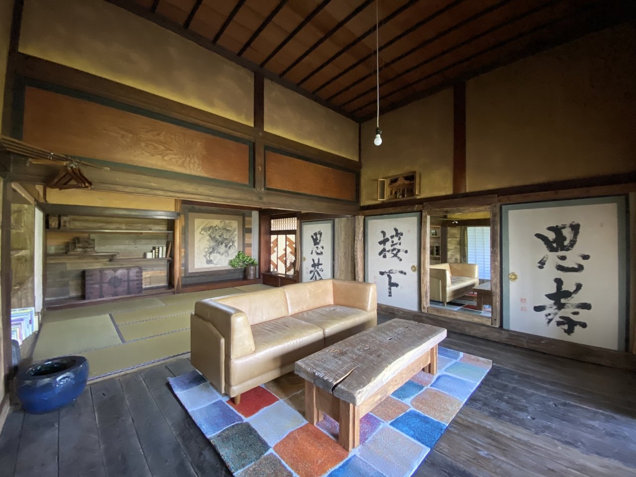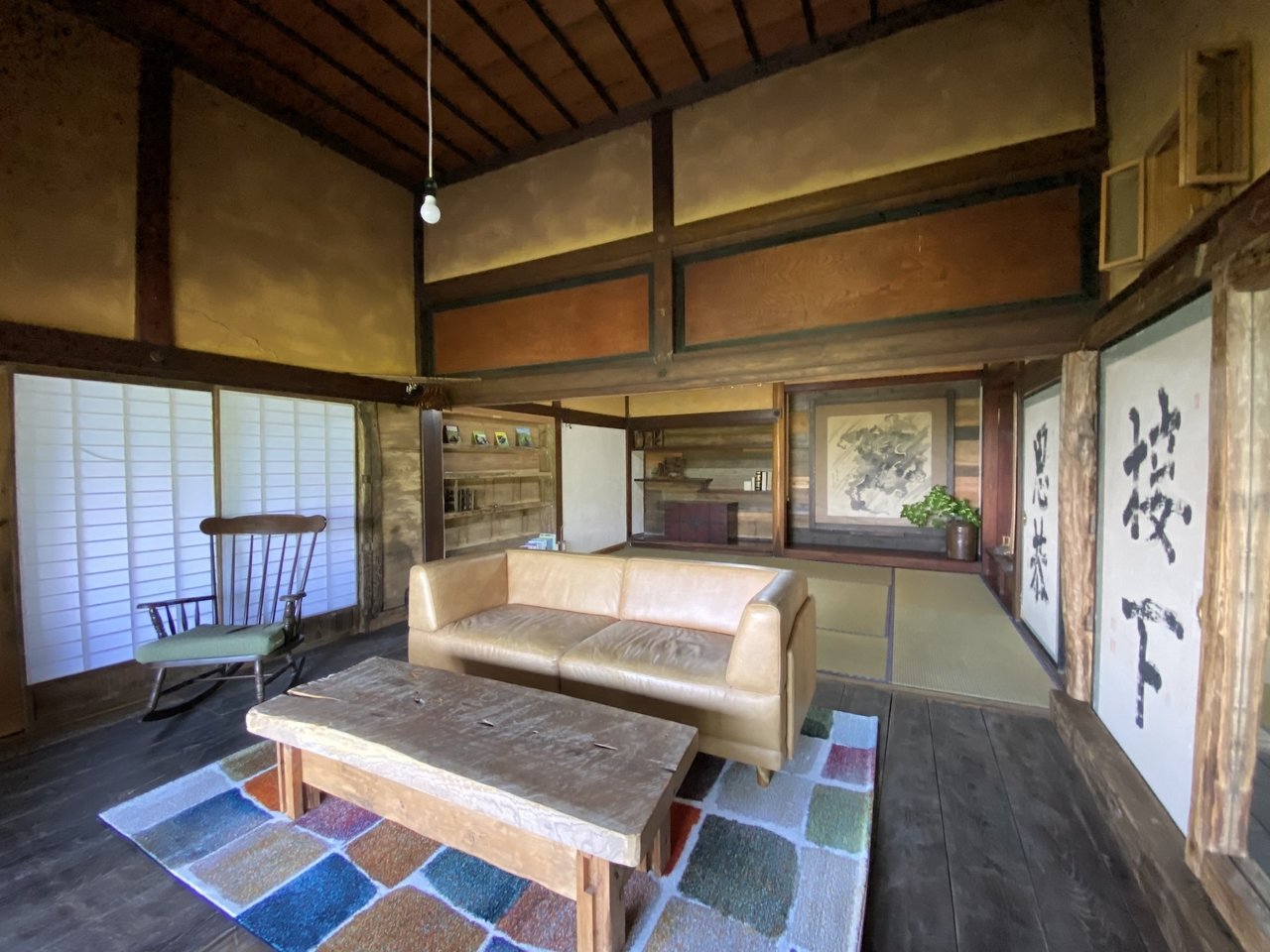 この母家の築年数は不明ですが、明治初期には寺子屋を開いていたと聞いています。太い大黒柱をはじめ、家自体の存在感、集落、ロケーションが気にいって移住し、以降、セルフリノベーションを積み重ねてきました。 歴史的風合いをできるかぎり残すために古材を使って施工しています。