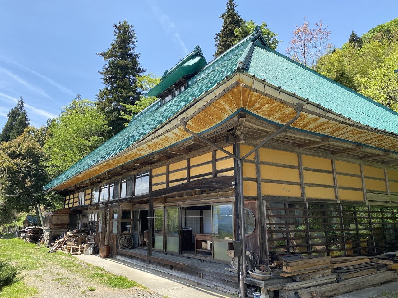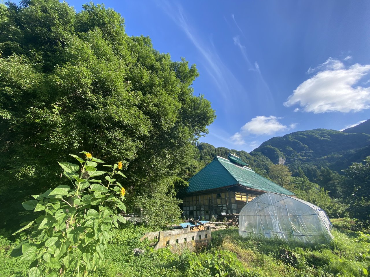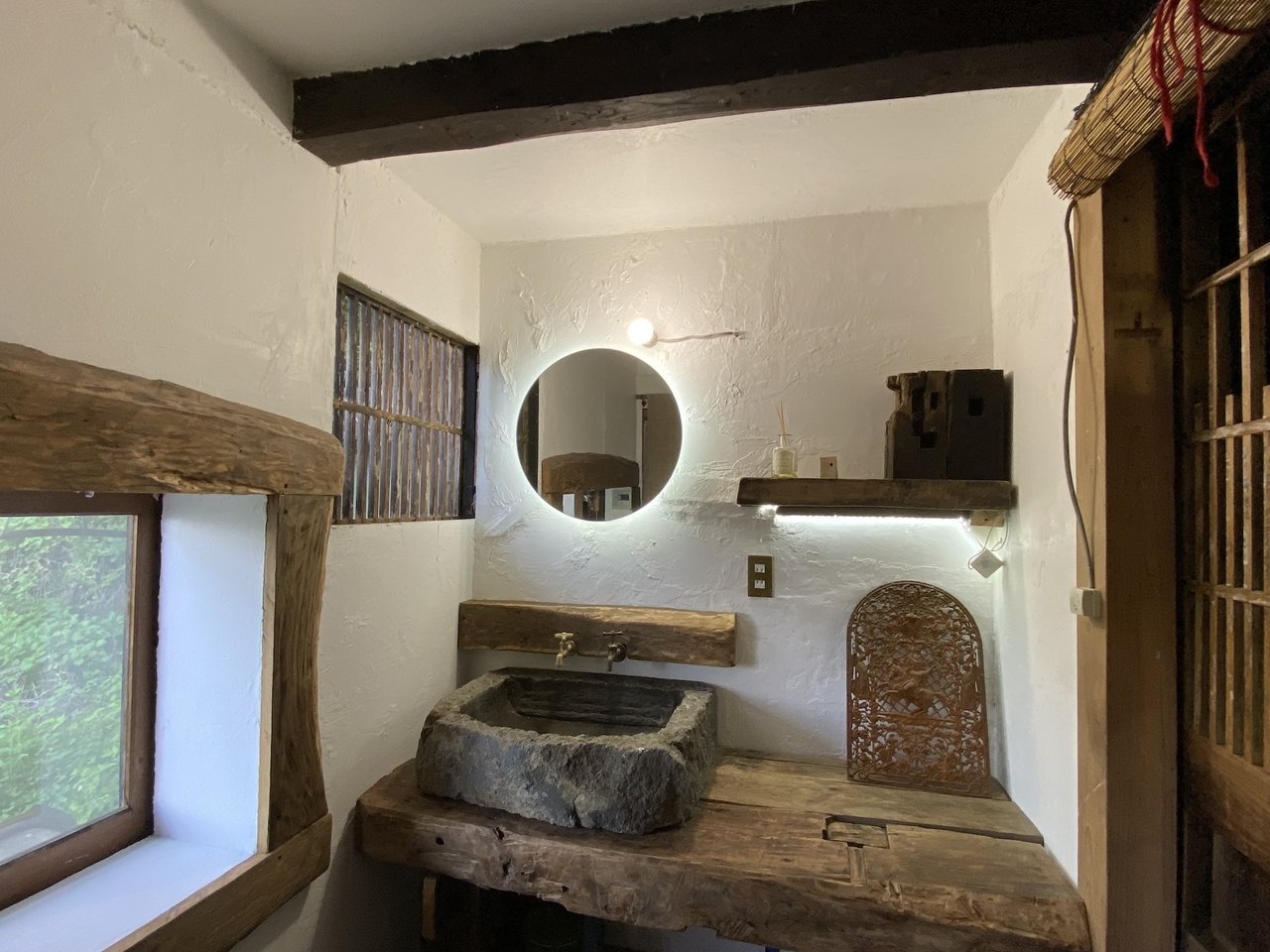 この母家の築年数は不明ですが、明治初期には寺子屋を開いていたと聞いています。太い大黒柱をはじめ、家自体の存在感、集落、ロケーションが気にいって移住し、以降、セルフリノベーションを積み重ねてきました。 歴史的風合いをできるかぎり残すために古材を使って施工しています。