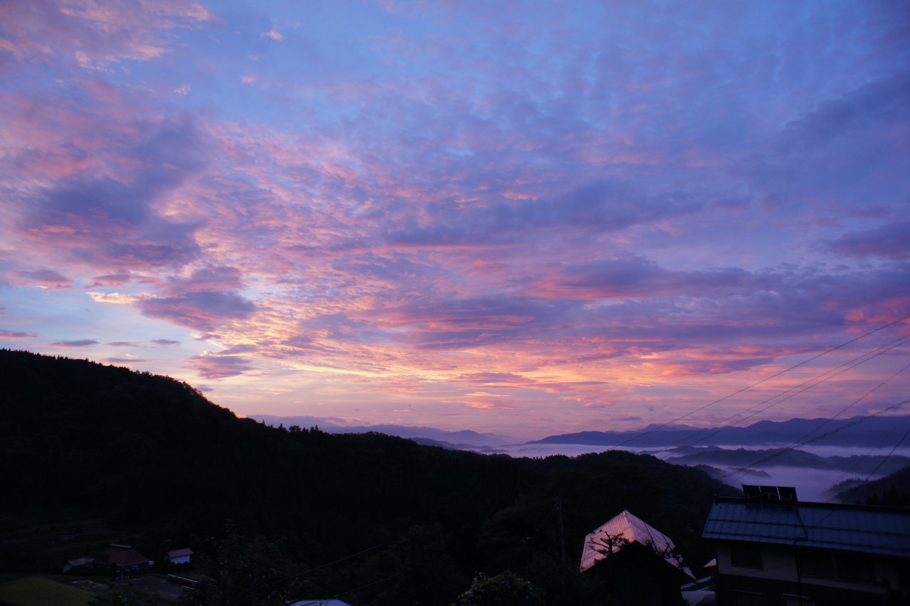 標高800m、山道を車で走っていくと昔話に出てくるような、どこか懐かしい風景が目の前に広がってきます。虫倉山、栃倉の棚田、トタン屋根の古民家が融合する小さな集落のなかに古民家あまねはあります。