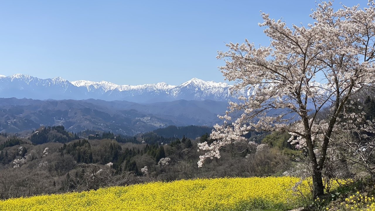 北アルプスの山々が眺められる場所です。春は菜の花が咲き、鯉のぼりが泳ぎます。野沢菜の季節には、自分で刈り取るお菜取りツアーの会場となります。古民家あまねから車で5分ぐらいです。