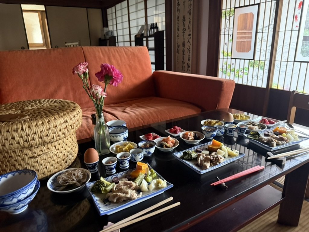 全て和室の寝室で、各3部屋、最大4組まで布団を敷けます。エアコン完備で、清潔なリネンとふかふかの布団、追加枕をご用意。窓からは庭や田畑の景色、柔らかな光、時折聞こえる鶏の声が届き、田舎らしい静けさの中でゆっくりお休みいただけます。