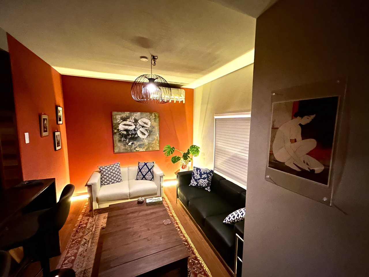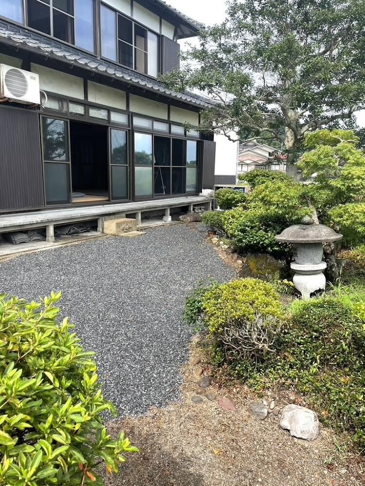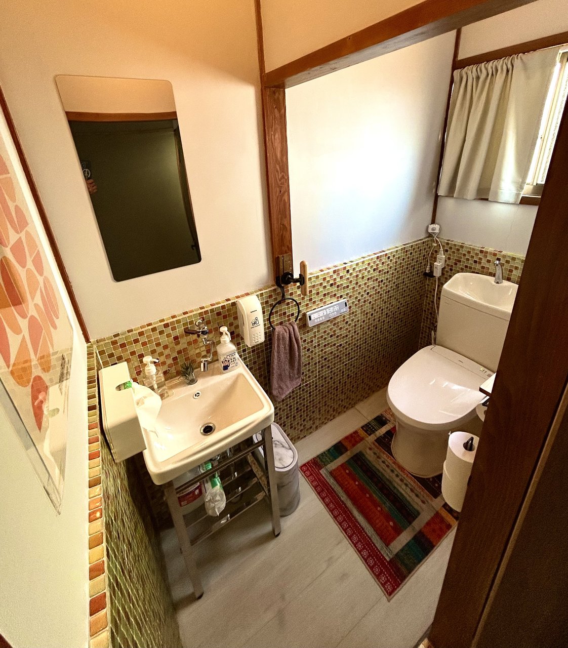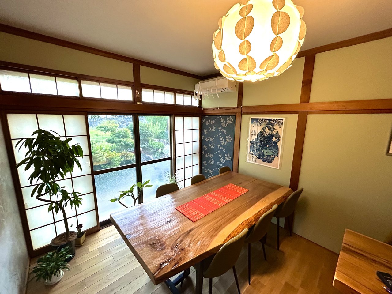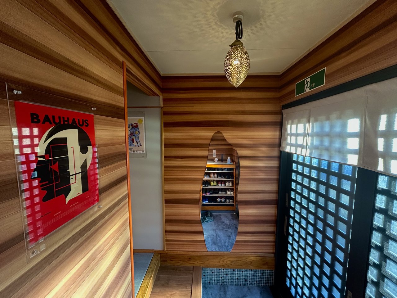 静かな古い城下町に佇む、古き良き日本家屋の外観。館内は、アート、ラグ、世界中から集められたオブジェで彩られた、温かみのある色彩豊かな空間です。