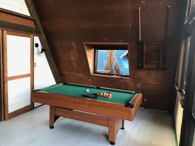 ・リビング : 開放的なスペースでお友達やご家族とゆったり過ごせます。また、ビリヤードやゲームグッズなども完備しておりますので、雨の日でもお楽しみいただけます。[2人掛けソファー×1、1人掛けソファー×1、エアコン、テレビ、DVDプレーヤー、ビリヤード台]