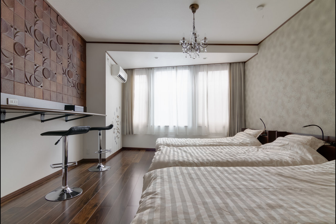 アパートは五つ星ホテルの基準で内装しております。面積は166㎡、施設完備のスキップフロア型マンションです。寝室は合計5つ、浴室1つ、トイレ2つ、広間1つ、最大五つの家庭で16人まで利用可能です!