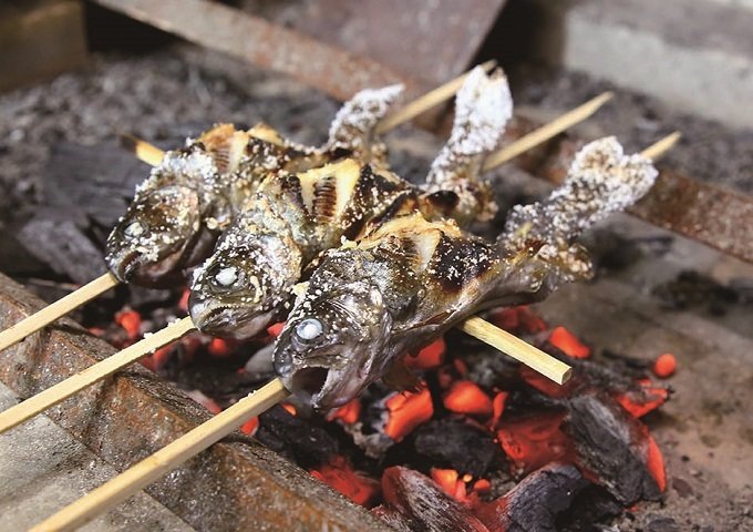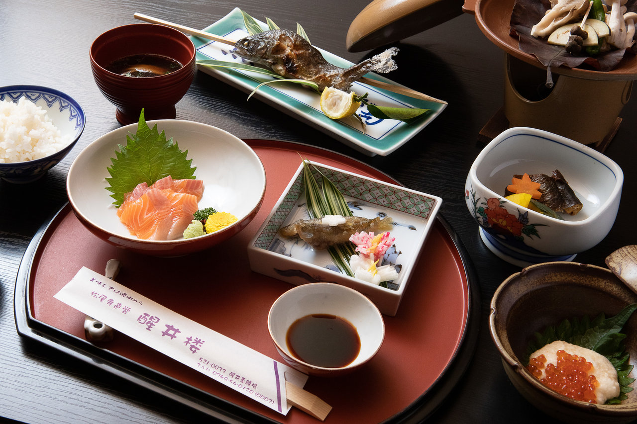 ご夕食は釣っていただいた魚を塩焼きに。マス懐石料理を堪能いただけます(また朝食は軽和食)
