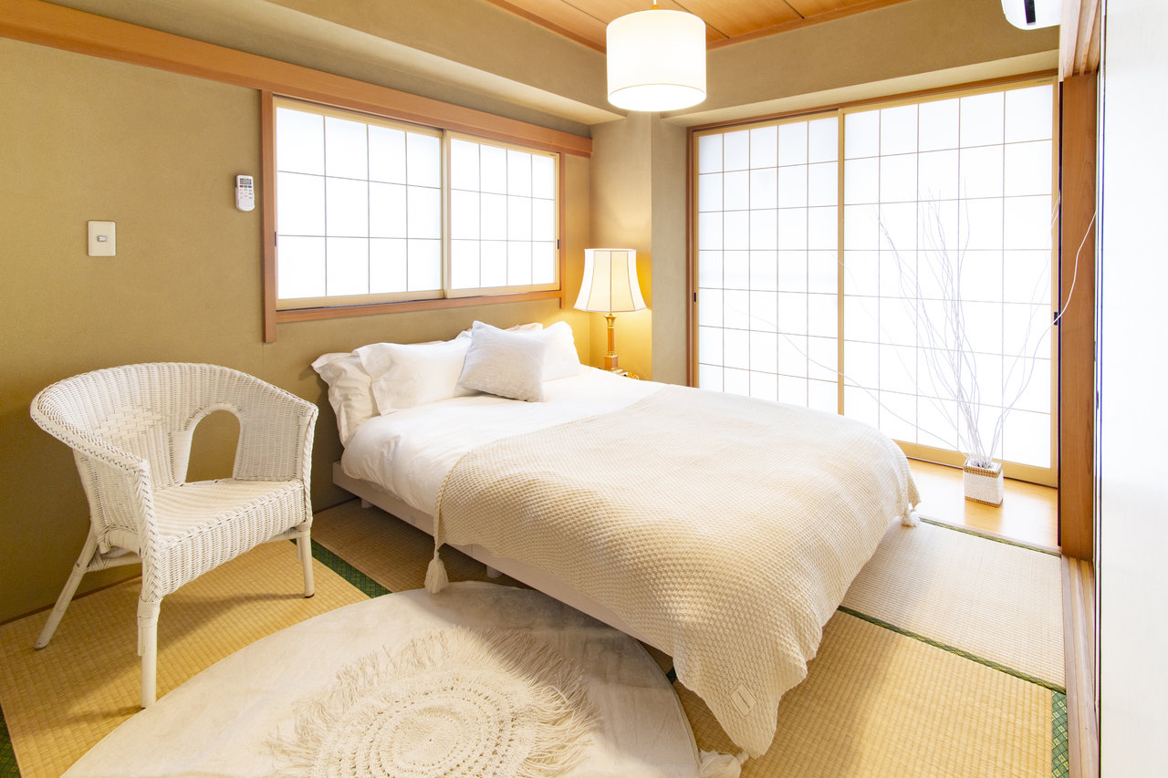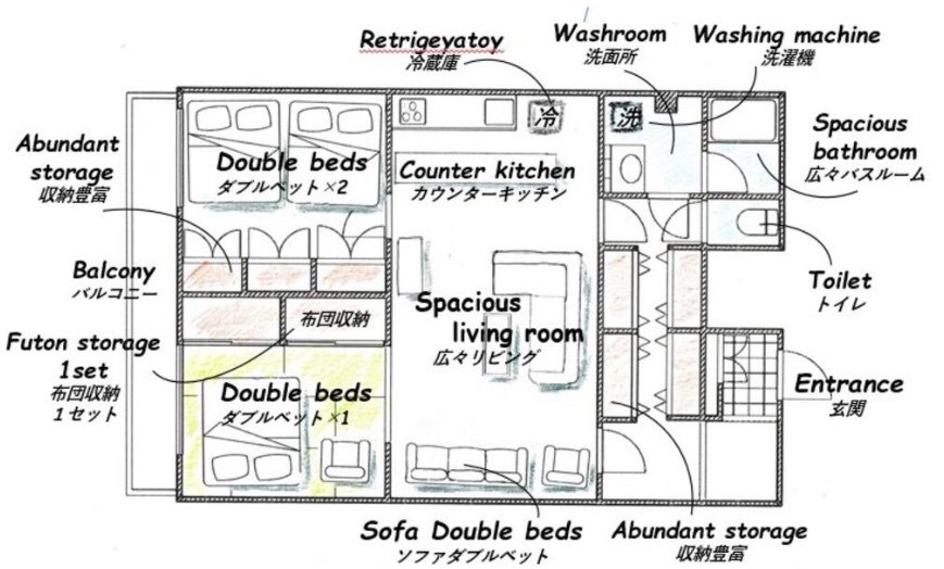 ベッドはダブルベッド3台、ソファベッド1台(ダブルサイズ)と日本の伝統的な布団1セット(ダブル)もご用意があります。