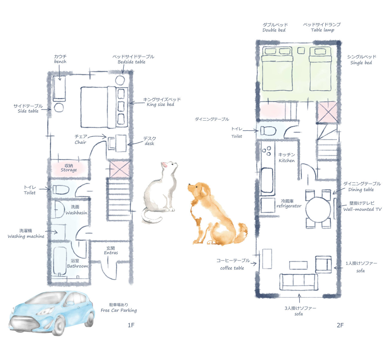 ●ペットをお連れの場合、事前に種類、頭数などの詳細をお知らせ下さい。合計2匹まで無料で泊まれます。