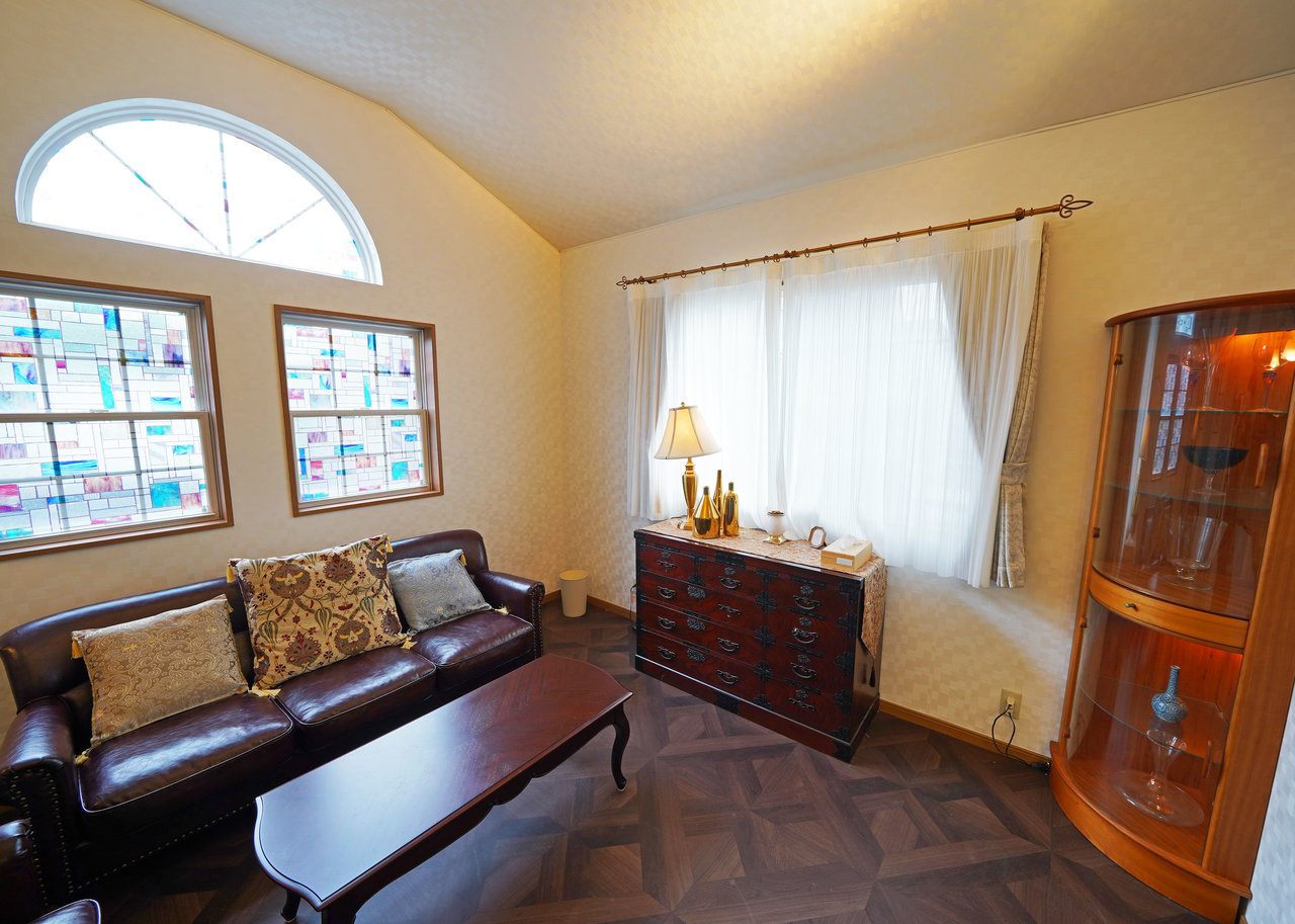 ステンドガラス仕様のリビングではソファでおくつろぎ頂けます