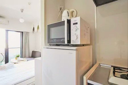 ●簡単な調理のできる器具と食器類、コンロ、冷蔵庫、冷凍庫、電子レンジ、ケトル