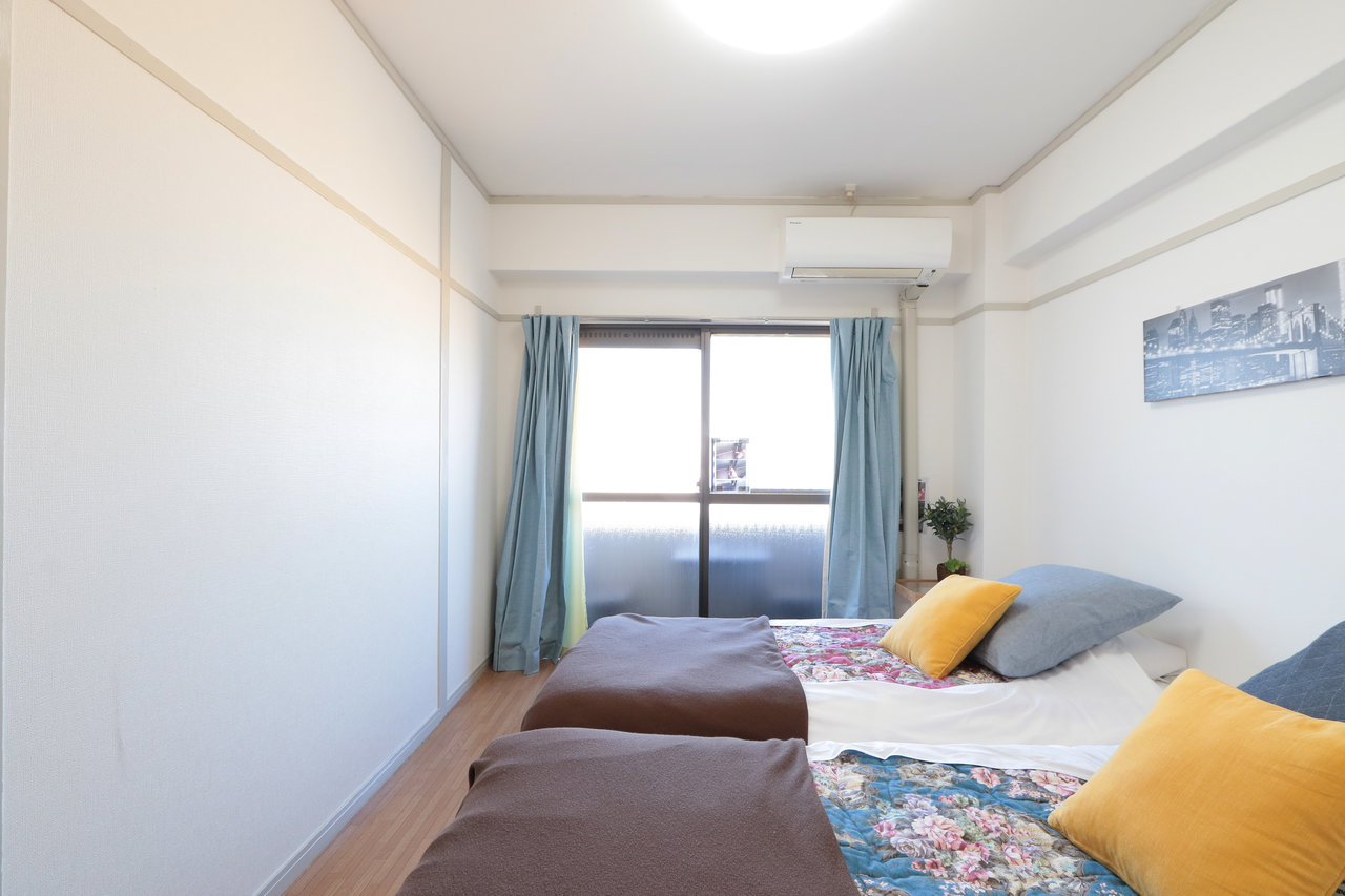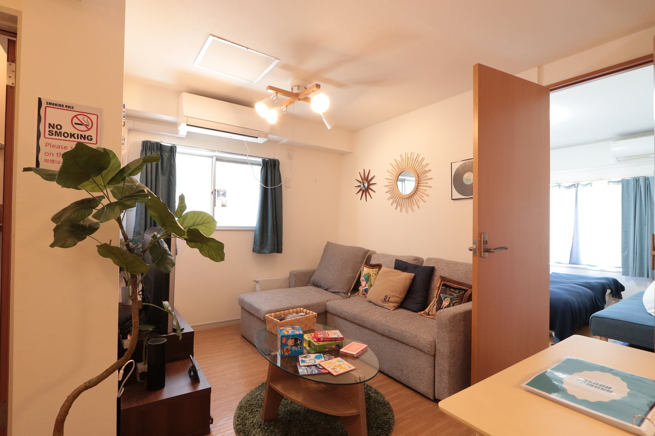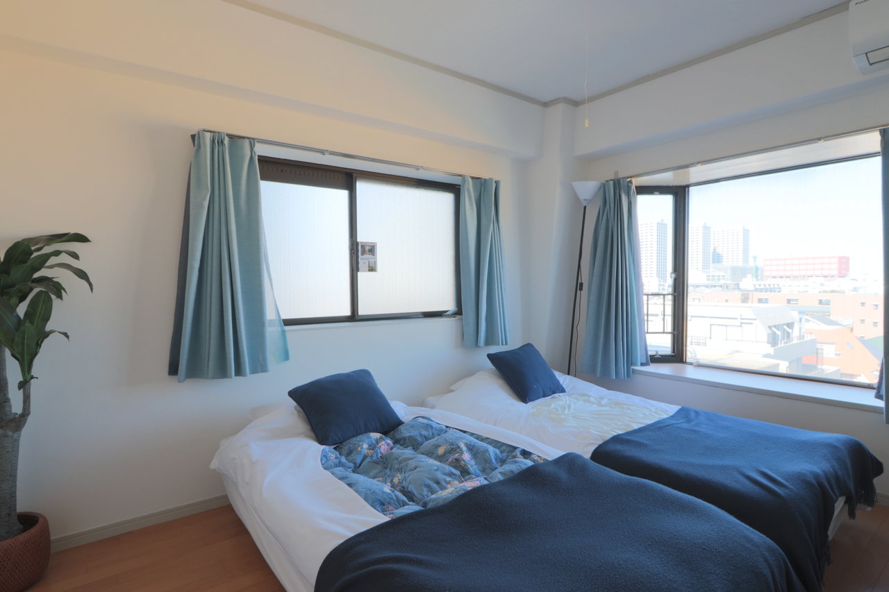 This apartment is fairly spacious, with a common room, three sleeping areas including two private rooms, a separate bathroom and toilet. There are nice views across the main street of the Korean Town around Shin-Obuko Station from the apartment as it is high up. You can use the kitchen facilities, including a two-ring gas stove to cook meals.
