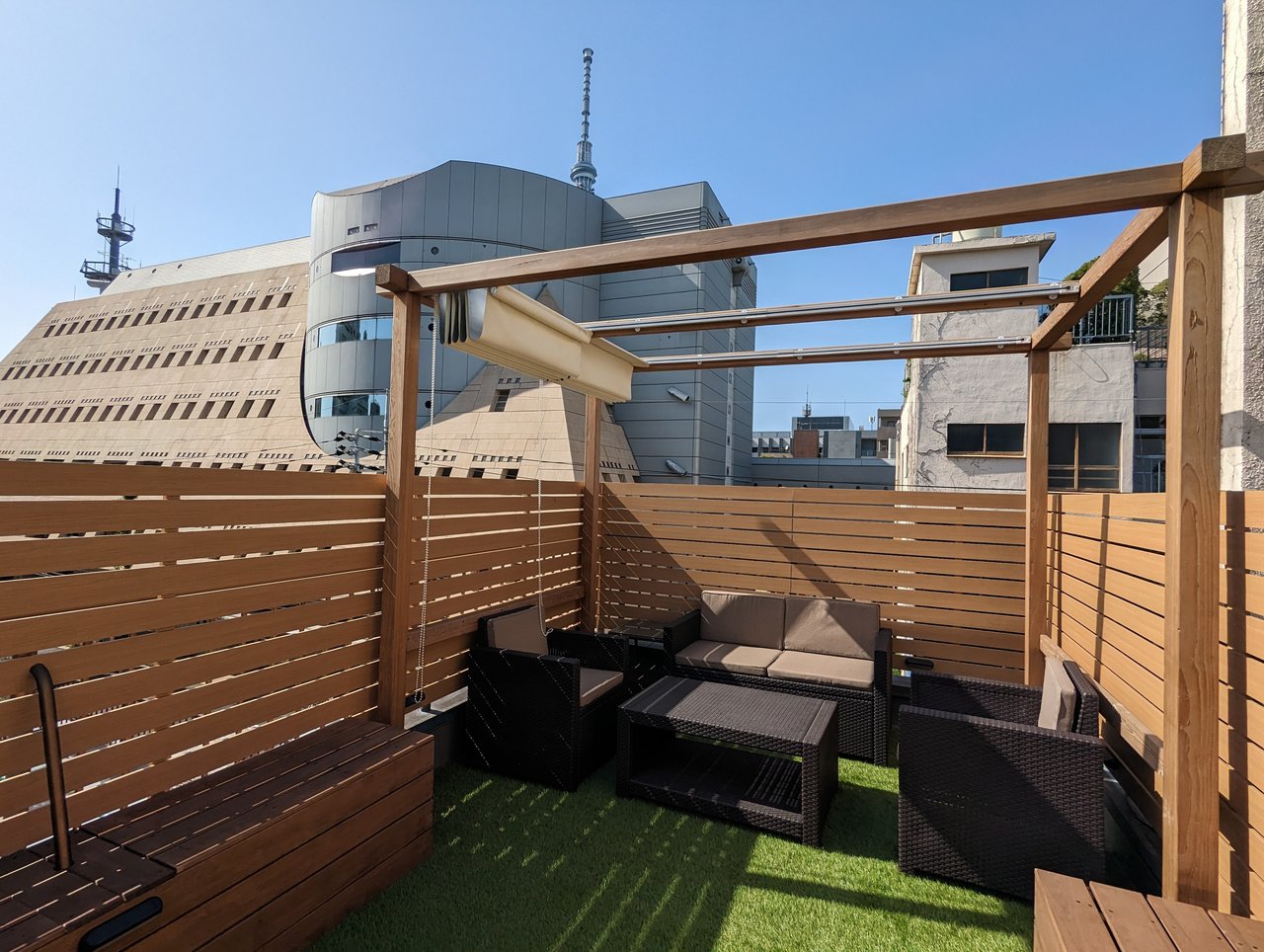 特に珍しい芝生ある屋上では、スカイツリーも見えます。ぜひ都会の中のオアシスをご御堪能いただけたらと思います。