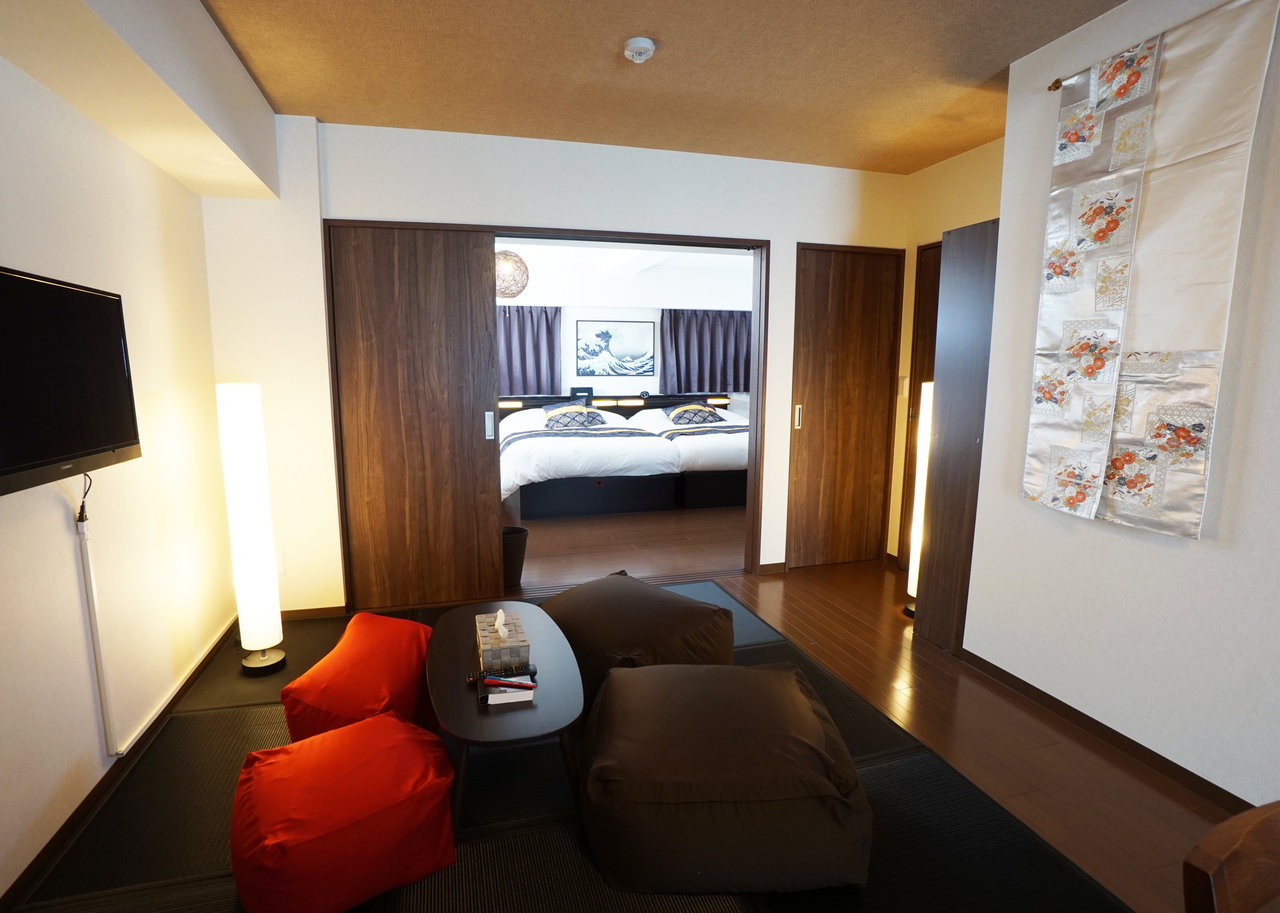 お部屋の広さは、都心にありながら何と約55㎡!4~8名様のグループでゆったりご宿泊頂けます。1部屋に最大10人まで宿泊可能!