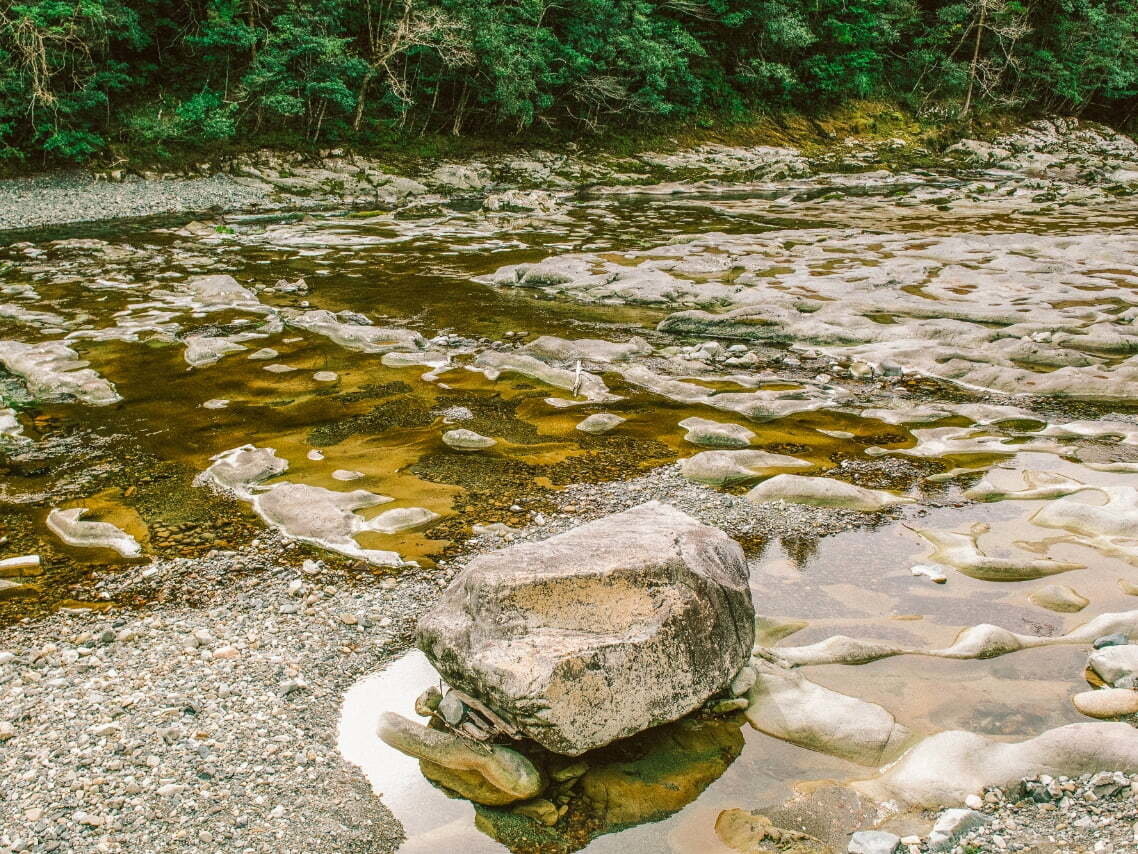 床岩に大小さまざまな岩穴が広がり、中央を清らかな滝が流れる神秘的な景観。