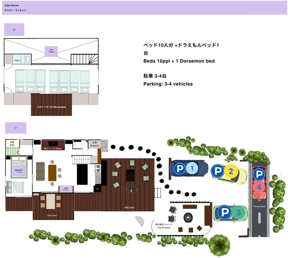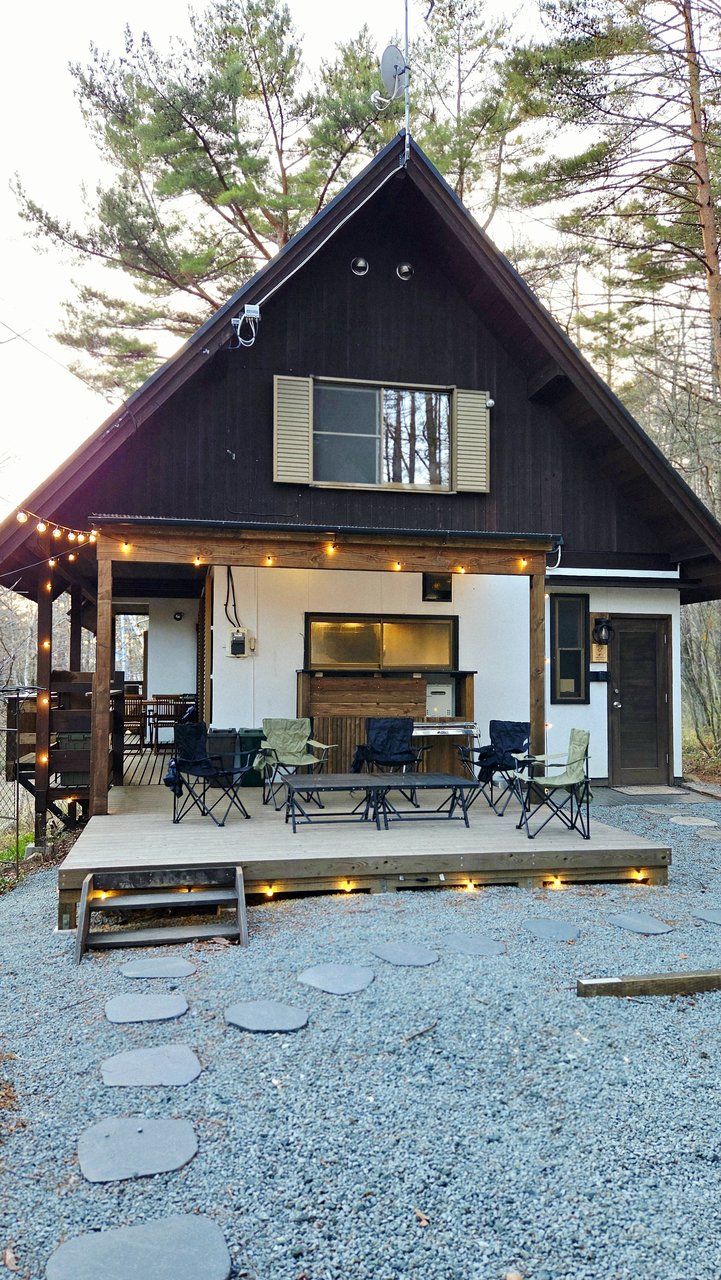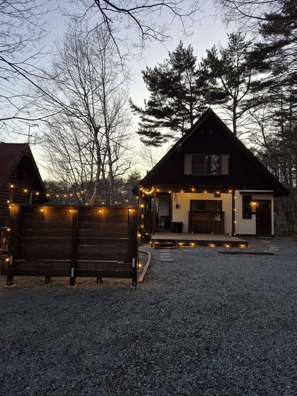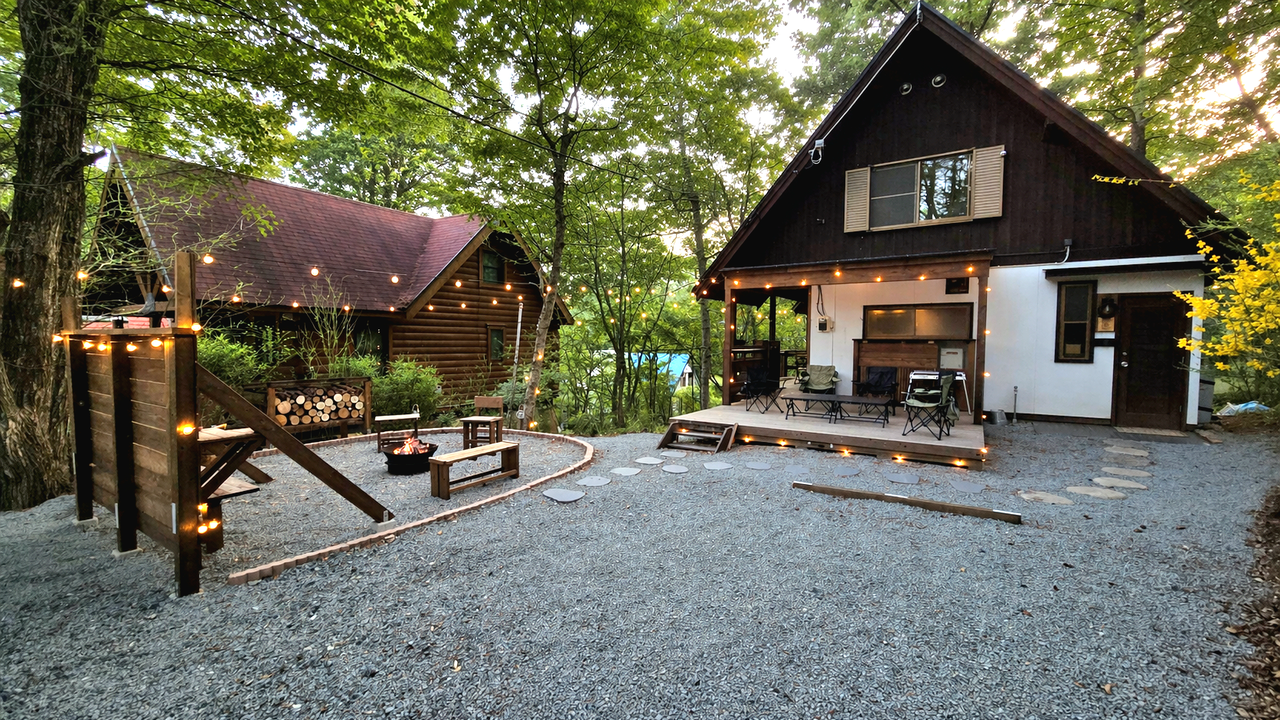 ロフトはグループで利用しやすい布団レイアウトがあり、1階にはクイーンベッドを備えた2〜3名向けの個室を用意しています。広いBBQデッキや屋外ファイヤーピットで、八ヶ岳の澄んだ空気の中でゆったりとした時間が過ごせます。駐車場は最大4台までご利用可能で、駐車スペースにも余裕があり、グループでそれぞれ別々にご到着される場合でも安心してお越しいただけます。