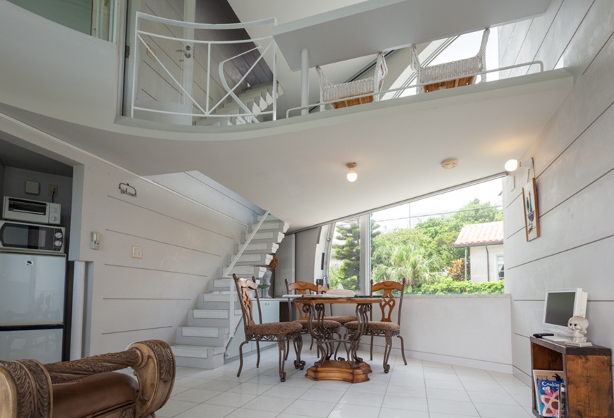 沖縄県読谷村の高台にあるコンドミニアム型の宿泊施設です。メゾネットタイプの客室から見下ろす東シナ海は、遠くに伊江島を望む絶景。地下にはプールとラウンジを備え、リゾート気分も味わえます。最大4名まで宿泊可能で、カップルや少人数グループに最適です。