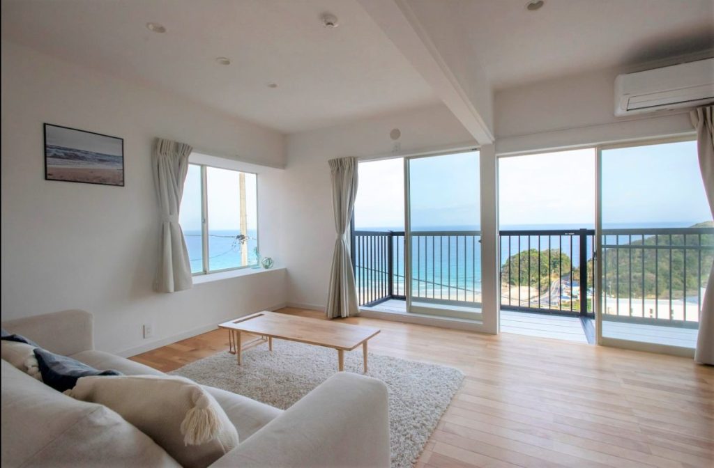 白い砂浜が一際輝く、白浜海岸を望むロケーションに建つ貸切ビーチハウス。窓の外には広がる海と波音が心地よく、朝は美しい朝日を楽しめる絶景が魅力です。海まで徒歩5分の距離で、自然を身近に感じながら、ゆったりと過ごす贅沢な時間が叶います。